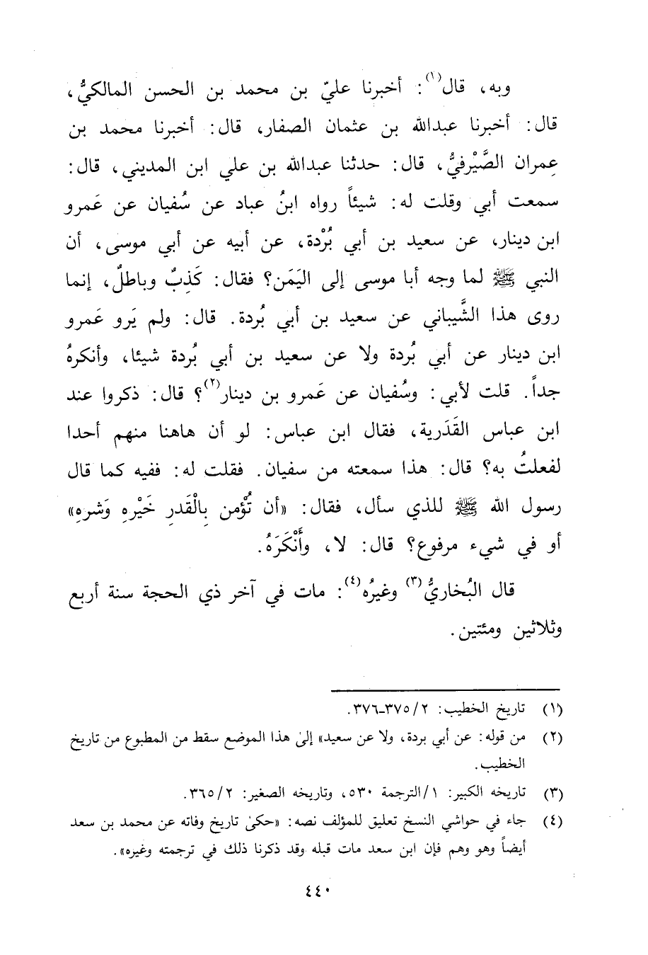 وبه، قال (1) : أَخْبَرَنَا عَلِيّ بْن مُحَمَّد بْن الْحَسَن المالكي، قال: أَخْبَرَنَا عَبد اللَّه بْن عثمان الصفار، قال: أخبرنا محمد بن عِمْران الصيرفي، قال: حَدَّثَنَا عَبد اللَّهِ بْن عَلِيِّ ابْن المديني، قال: سمعت أبي وقلت له: شيئا رواه ابن عباد عن سفيان عن عَمْرو ابن دِينَارٍ، عَنْ سَعِيد بْنِ أَبي بردة، عَن أَبِيهِ عَن أَبِي مُوسَى، أَنَّ النَّبِيَّ صَلَّى اللَّهُ عليه وسلم لما وجه أبا موسى إلى اليمن؟ فقال: كذب وباطل، إنما روى هذا الشيباني عن سَعِيد بْن أَبي بردة. قال: ولم يرو عَمْرو ابن دينار عَن أبي بردة ولا عن سَعِيد بْن أَبي بردة شيئا، وأنكره جدا. قلتُ لأبي: وسُفْيَان عن عَمْرو بْن دينار (2) ؟ قال: ذكروا عند ابن عباس القدرية، فقال ابن عباس: لو أن هاهنا منهم أحدا لفعلت به؟ قال: هذا سمعته من سُفْيَان. فقلت له: ففيه كما قال رَسُولُ اللَّهِ صلى الله عليه وسلم للذي سأل، فقال: "أن تؤمن بالقدر خيره وشره "أو في شيء مرفوع؟ قال: لا، وأنكره.