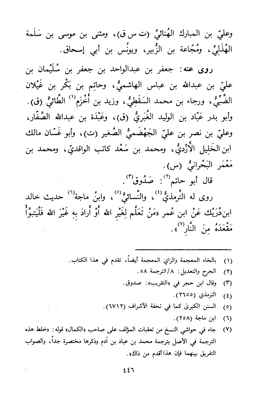 (7) جاء في حواشي النسخ من تعقبات المؤلف على صاحب "الكمال "قوله: "خلط هذه الترجمة في الاصل بترجمة مُحَمَّد بْن عباد بْن آدم وذكرها مختصرة جدا، والصواب التفريق بينهما فإن هذا أقدم من ذاك ".