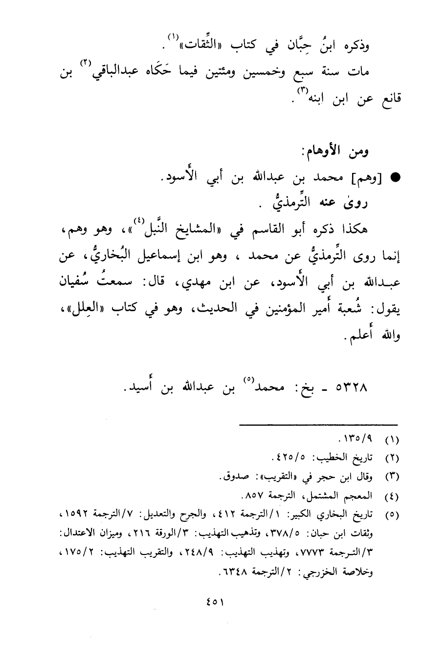 (5) تاريخ البخاري الكبير: 1 / الترجمة 412، والجرح والتعديل: 7 / الترجمة 1592، وثقات ابن حبان: 5 / 378، وتذهيب التهذيب: 3 / الورقة 216، وميزان الاعتدال: 3 / الترجمة 7773، وتهذيب التهذيب: 9 / 248، والتقريب التهذيب: 2 / 175، وخلاصة الخزرجي: 2 / الترجمة 6348.