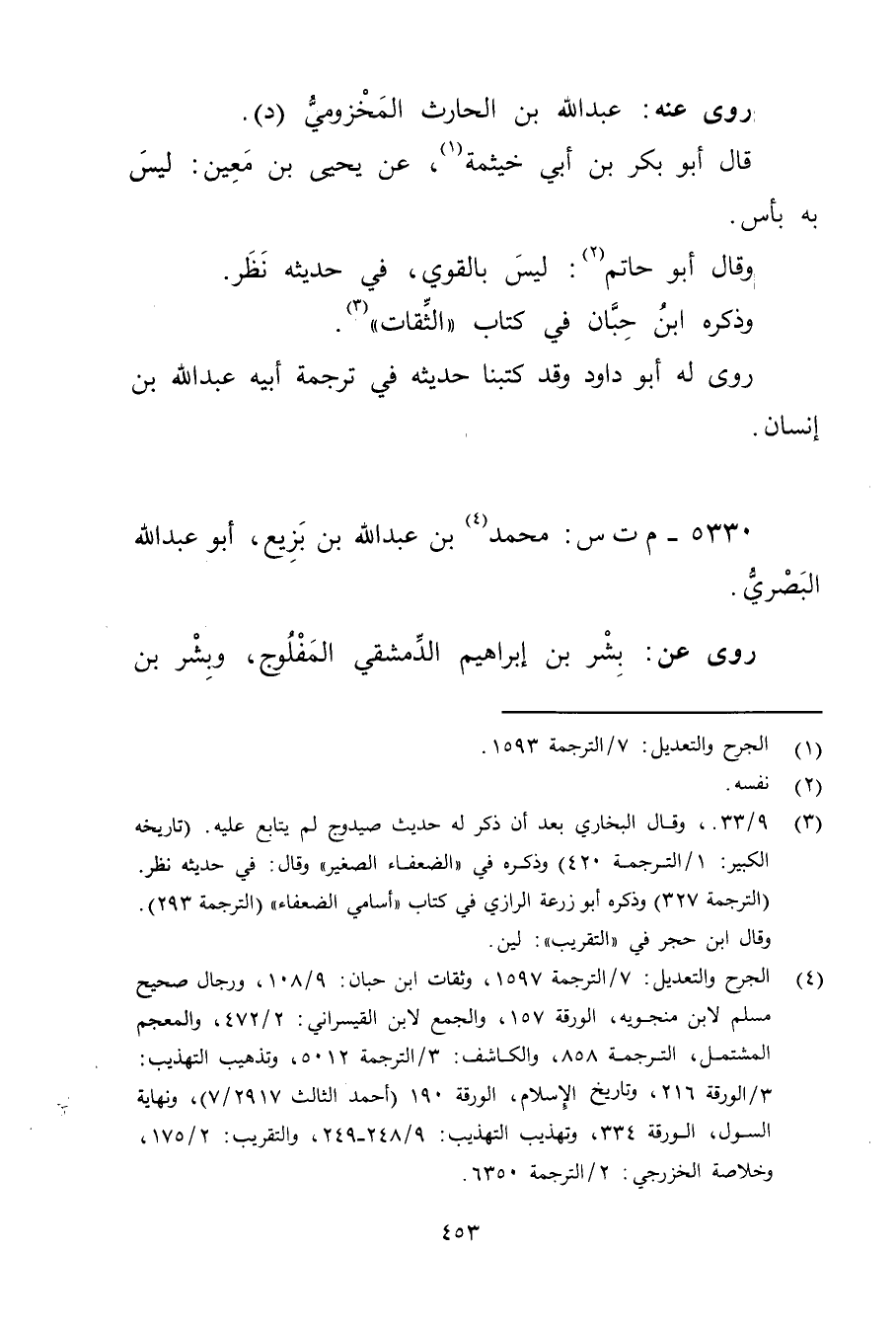 (4) الجرح والتعديل: 7 / الترجمة 1597، وثقات ابن حبان: 9 / 108، ورجال صحيح مسلم لابن منجويه، الورقة 157، والجمع لابن القيسراني: 2 / 472، والمعجم المشتمل، الترجمة 858، والكاشف: 3 / الترجمة 5012، وتذهيب التهذيب: 3 / الورقة 216، وتاريخ الاسلام، الورقة 190 (أحمد الثالث 2917 / 7) ، ونهاية السول، الورقة 334، وتهذيب التهذيب: 9 / 248 - 249، والتقريب: 2 / 175، وخلاصة الخزرجي: 2 / الترجمة 6350.