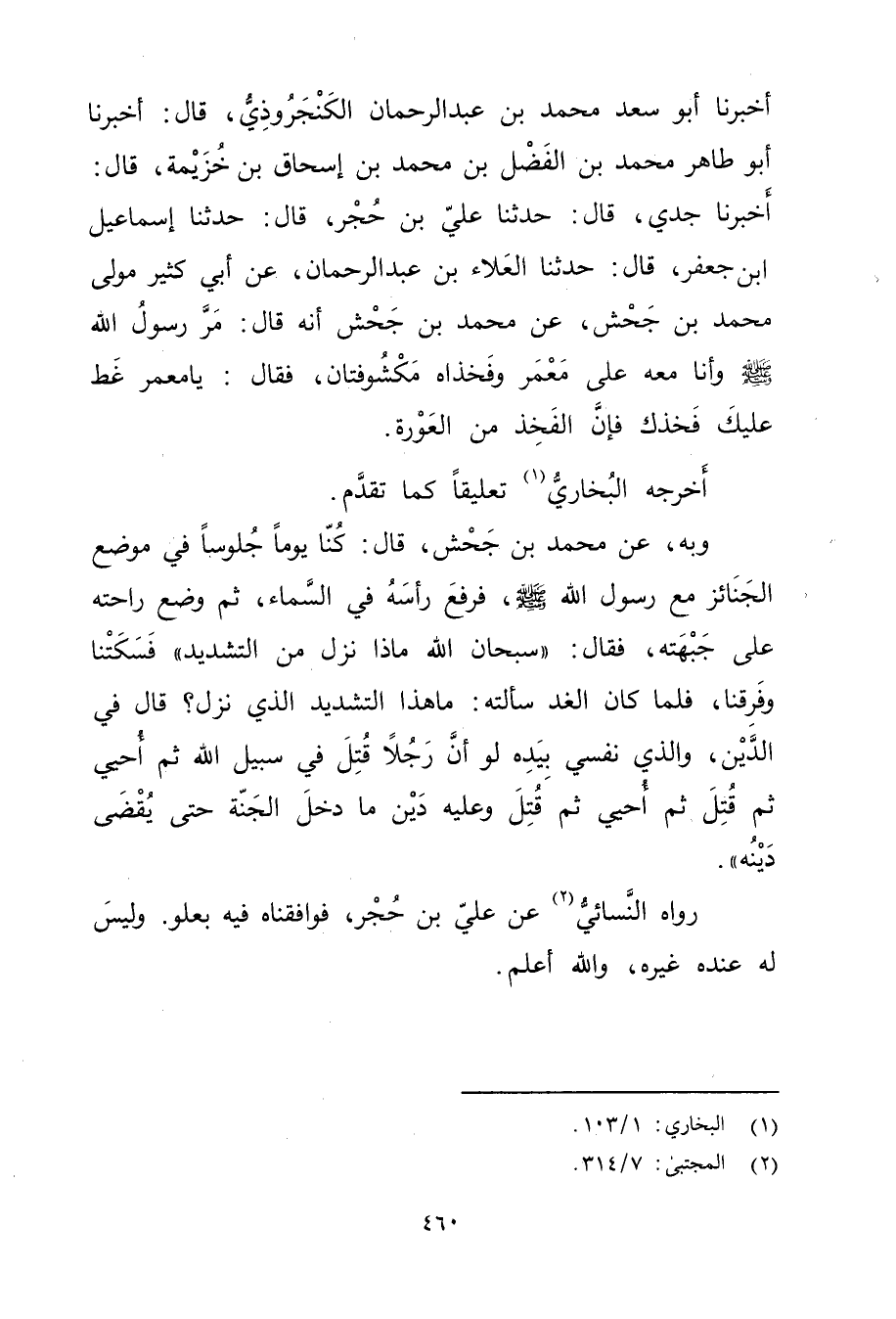 أَخْبَرَنَا أَبُو سَعْدٍ مُحَمَّدُ بْنُ عَبْدِ الرَّحْمَنِ الْكَنْجَرُوذِيُّ، قال: أَخْبَرَنَا أَبُو طَاهِرٍ مُحَمَّدُ بْنُ الْفَضْلِ بْن مُحَمَّد بْن إسحاق بْن خُزَيْمَةَ، قال: أَخْبَرَنَا جَدِّي، قال: حَدَّثَنَا عَلِيُّ بْنُ حُجْرٍ، قال: حَدَّثَنَا إسماعيل ابن جَعْفَرٍ، قال: حَدَّثَنَا الْعَلاءُ بْنُ عَبْدِ الرَّحْمَنِ، عَن أَبِي كَثِيرٍ مَوْلَى مُحَمَّدِ بْنِ جَحْشٍ، عَنْ مُحَمَّدِ بْنِ جَحْشٍ أَنَّهُ قال: مر رَسُول اللَّهِ صَلَّى اللَّهُ عَلَيْهِ وسَلَّمَ وأَنَا مَعَهُ عَلَى مَعْمَرٍ وفَخِذَاهُ مَكْشُوفَتَانِ، فَقَالَ: يَا مَعْمَرُ غَطِّ عَلَيْكَ فَخِذَكَ فَإِنَّ الْفَخِذَ مِنَ الْعَوْرَةِ.