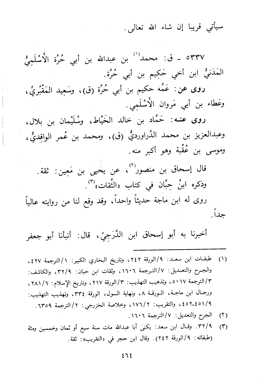 5337 - ق: مُحَمَّد بن عَبد الله بن أَبي حرة الأَسلميّ المدني ابْن أخي حكيم بْن أَبي حرة (1) .