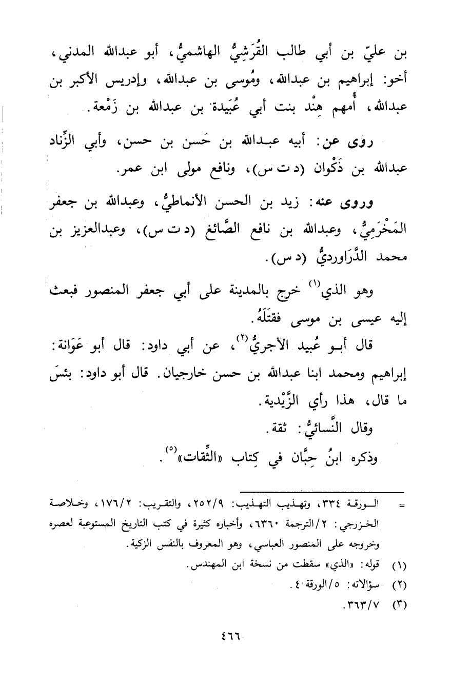 = الورقة 334، وتهذيب التهذيب: 9 / 252، والتقريب: 2 / 176، وخلاصة الخزرجي: 2 / الترجمة 6360، وأخباره كثيرة في كتب التاريخ المستوعبة لعصره وخروجه على المنصور العباسي، وهو المعروف بالنفس الزكية.