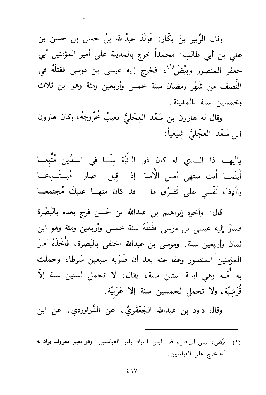 (1) بيض: لبس البياض، ضد لبس السواد لباس العباسيين، وهو تعبير معروف يراد به أنه خرج على العباسيين.