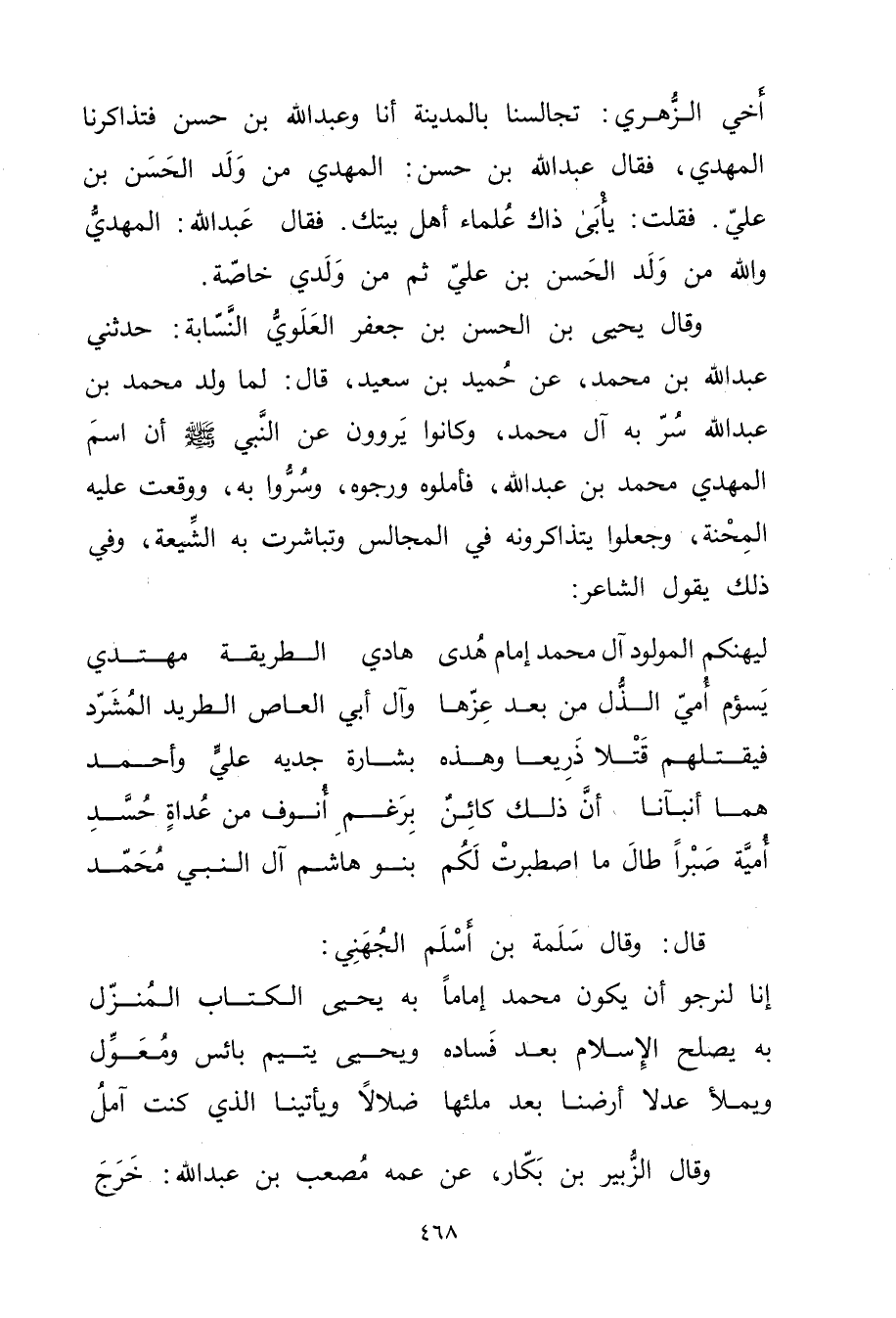 وَقَال يَحْيَى بْن الْحَسَن بْن جَعْفَر العلوي النسابة: حدثني عَبد اللَّه بْن مُحَمَّد، عن حميد بْن سَعِيد، قال: لما ولد مُحَمَّد بْن عَبد اللَّه سر به آل مُحَمَّد، وكانوا يروون عَنِ النَّبِيِّ صَلَّى اللَّهُ عليه وسلم أن اسم المهدي مُحَمَّد بْن عَبد اللَّه، فأملوه ورجوه، وسروا به، ووقعت عليه المحنة، وجعلوا يتذاكرون في المجالس وتباشرت به الشيعة، وفي ذلك يقول الشاعر: