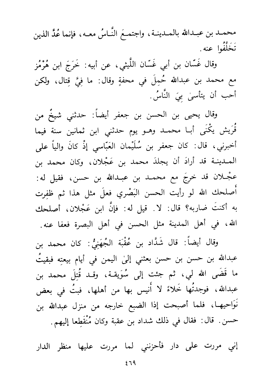 وَقَال أيضا: قال شداد بْن عقبة الجهني: كان مُحَمَّد بْن عَبد اللَّه بْن حسن بْن حسن بعثني إلى اليمن في أيام بيعته فبقيت ما قضى اللَّه لي، ثم جئت إلى سويقة، وقد قتل مُحَمَّد بْن عَبد اللَّه، فوجدتها خلاء لا أنيس بها من أهلها، فبت في بعض نواحيها، فلما أصبحت إذا الضبع خارجة من منزل عَبد اللَّه بْن حسن. قال: فقال في ذلك شداد بْن عقبة وكان منقطعا إليهم.