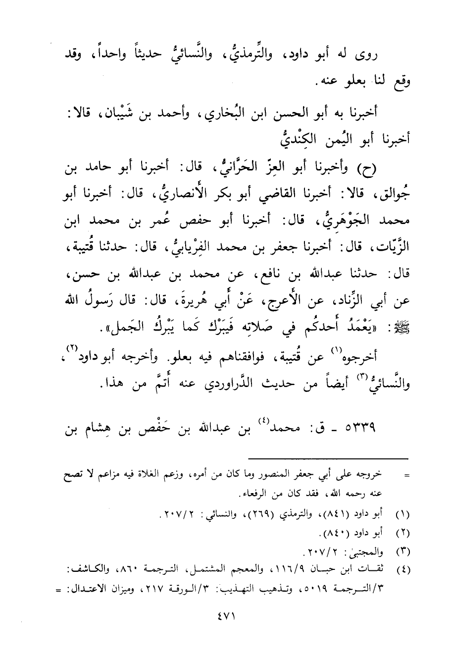 (ح) وأَخْبَرَنَا أَبُو الْعِزِّ الْحَرَّانِيُّ، قال: أَخْبَرَنَا أَبُو حَامِدِ بْنُ جُوَالِقٍ، قَالا: أَخْبَرَنَا الْقَاضِي أَبُو بكر الأَنْصارِيّ، قال: أَخْبَرَنَا أَبُو مُحَمَّد الجوهري، قال: أَخْبَرَنَا أَبُو حَفْص عُمَر بْن محمد ابن الزَّيَّاتِ، قال: أخبرنا جَعْفَرُ بْنُ مُحَمَّدٍ الْفِرْيَابِيُّ، قال: حَدَّثَنَا قُتَيْبَةُ، قال: حَدَّثَنَا عَبد اللَّهِ بْن نَافِعٍ، عَنْ مُحَمَّدِ بْنِ عَبد اللَّهِ بْنِ حَسَنٍ، عَن أَبِي الزِّنَادِ، عَنِ الأَعْرَجِ، عَن أَبِي هُرَيْرة، قال: قال رَسُولُ اللَّهِ صَلَّى اللَّهُ عَلَيْهِ وسَلَّمَ: "يَعْمَدُ أَحَدُكُمْ فِي صَلاتِهِ فَيَبْرِكُ كَمَا يَبْرِكُ الْجَمَلُ.
