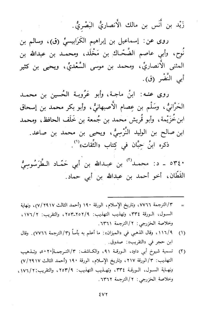 (2) تسمية شيوخ أبي داود، الورقة 91، والكاشف: 3 / الترجمة 5020، وتذهيب التهذيب: 3 / الورقة 217، وتاريخ الاسلام، الورقة 190 (أحمد الثالث 2917 / 7) ونهاية السول، الورقة 334، وتهذيب التهذيب: 9 / 253، والتقريب: 2 / 176، وخلاصة الخزرجي: 2 / الترجمة 6362.
