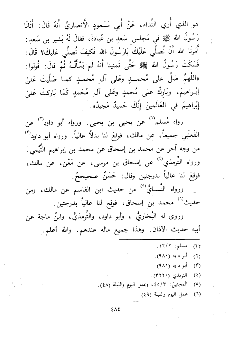 هُوَ الَّذِي أُرِيَ النِّدَاءُ، عَن أَبِي مَسْعُودٍ الأَنْصارِيّ أَنَّهُ قال: أَتَانَا رَسُولُ اللَّهِ صلى الله عَلَيْهِ وسَلَّمَ فِي مَجْلِسِ سَعْدِ بْنِ عُبَادَةَ، فَقَالَ لَهُ بَشِيرُ بْنُ سَعْدٍ: أَمَرَنَا اللَّهُ أَنْ نُصَلِّيَ عَلَيْكَ يَا رَسُولَ اللَّهِ فَكَيْفَ نُصَلِّي عَلَيْكَ؟ قال: فَسَكَتَ رَسُول اللَّهِ صلى الله عليه وسَلَّمَ حَتَّى تَمَنْيَنَا أَنَّهُ لَمْ يَسْأَلْهُ ثُمَّ قال: قُولُوا: "اللَّهُمَّ صَلِّ عَلَى مُحَمَّدٍ وعَلَى آلِ مُحَمَّدٍ كَمَا صَلَّيْتَ عَلَى إِبْرَاهِيمَ، وبَارِكْ عَلَى مُحَمَّدٍ وعَلَى آلِ مُحَمَّد كما باركت على إِبْرَاهِيم فِي الْعَالَمِينَ إِنَّكَ حَمِيدٌ مَجِيدٌ.