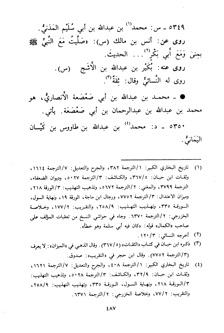 (4) تاريخ البخاري الكبير: 1 / الترجمة 408، والجرح والتعديل: 7 / الترجمة 1621، وثقات ابن حبان: 9 / 32، والكاشف: 3 / الترجمة 5028، وتذهيب التهذيب: 3 / الورقة 218، ونهاية السول، الورقة 335، وتهذيب التهذيب: 9 / 258، والتقريب: 2 / 77، وخلاصة الخزرجي: 2 / الترجمة 6371.