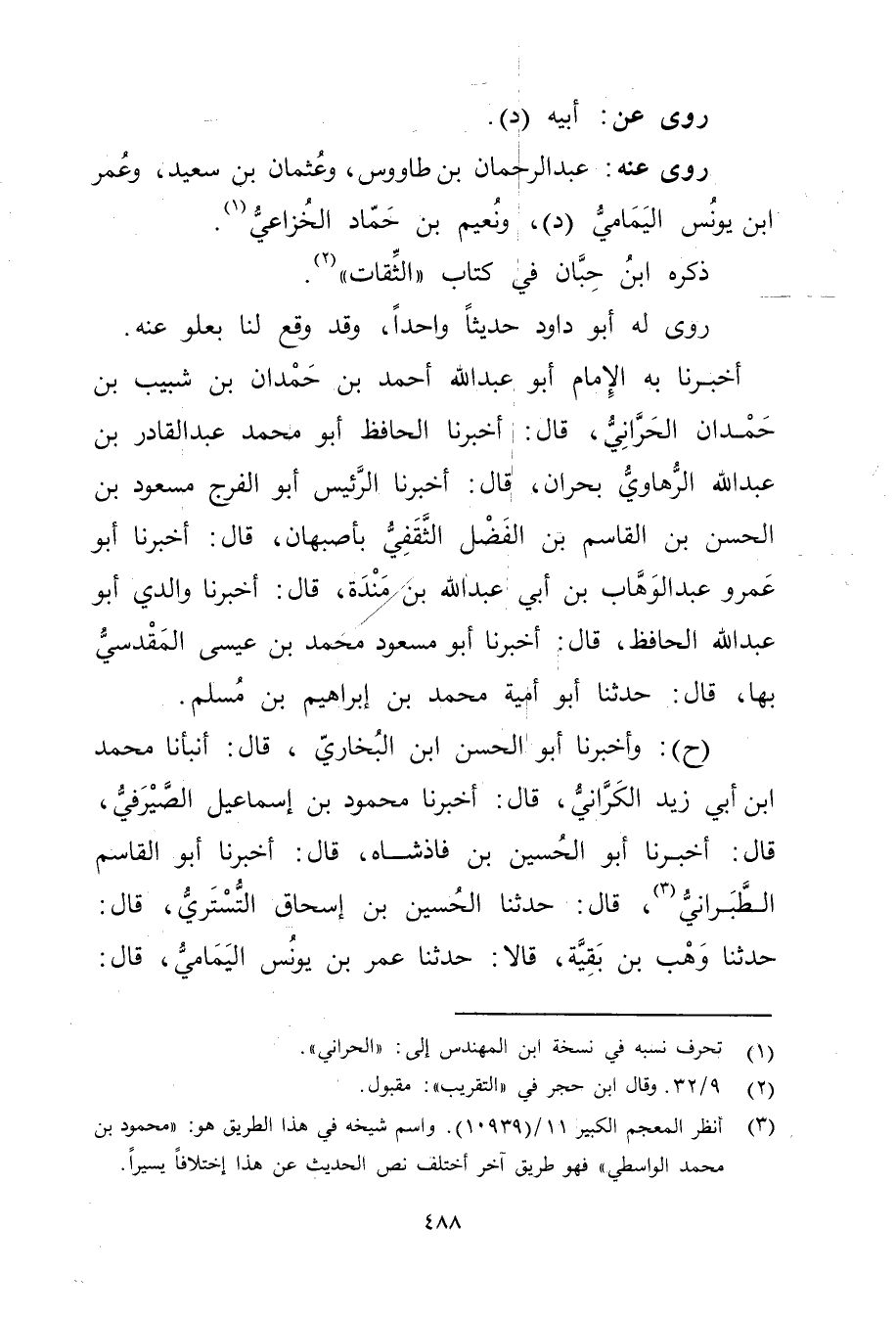 أَخْبَرَنَا بِهِ الإِمَامُ أَبُو عَبْدِ اللَّهِ أَحْمَدُ بْنُ حَمْدَانَ بْنِ شَبِيبِ بْنِ حَمْدَانَ الْحَرَّانِيُّ، قال: أَخْبَرَنَا الْحَافِظُ أَبُو مُحَمَّدٍ عَبْدُ الْقَادِرِ بْنُ عَبد اللَّهِ الرُّهَاوِيُّ بِحَرَّانَ، قال: أَخْبَرَنَا الرَّئِيسُ أَبُو الْفَرَجِ مَسْعُودُ بْنُ الْحَسَنِ بْنِ الْقَاسِمِ بْنِ الْفَضْلِ الثَّقَفِيُّ بِأَصْبَهَانَ، قال: أَخْبَرَنَا أَبُو عَمْرو عَبْدُ الْوَهَّابِ بْنُ أَبي عَبد اللَّهِ بْنِ مَنْدَةَ، قال: أَخْبَرَنَا والِدِي أَبُو عَبد اللَّهِ الْحَافِظُ، قال: أخبرنا أَبُو مسعود مُحَمَّد بْن عيسى المقدسي بها، قال: حَدَّثَنَا أَبُو أمية مُحَمَّد بْن إِبْرَاهِيم بْن مسلم.