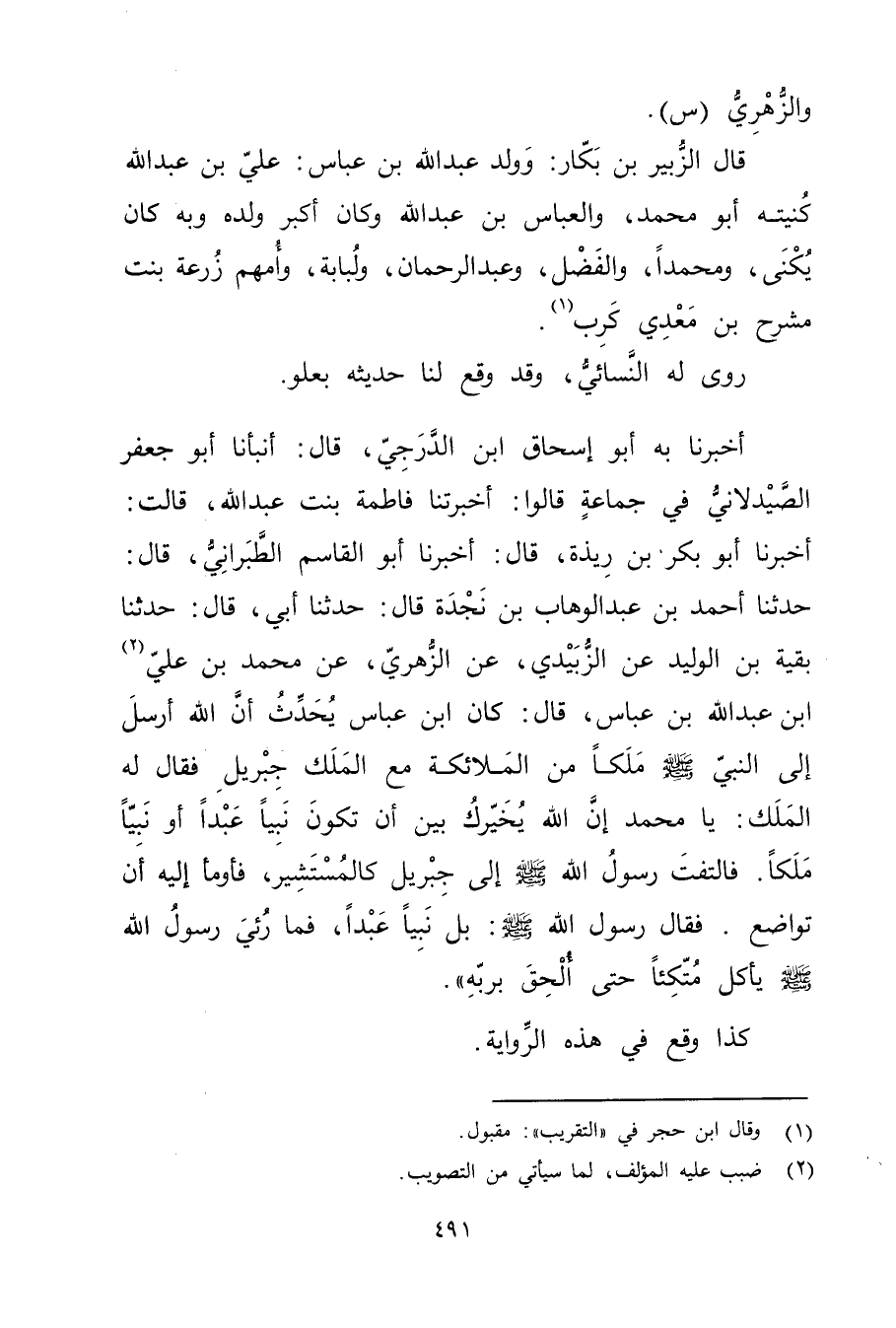 أخبرنا أَبُو إِسْحَاقَ ابْنُ الدَّرَجِيِّ، قال: أَنْبَأَنَا أَبُو جعفر الصَّيْدَلانِيّ فِي جماعة قَالُوا: أَخْبَرَتْنا فَاطِمَةُ بِنْتُ عَبد اللَّهِ، قَالَتْ: أخبرنا أَبُو بَكْرِ بْنِ رِيذَةَ، قال: أخبرنا أَبُو الْقَاسِمِ الطَّبَرَانِيُّ، قال: حَدَّثَنَا أَحْمَدُ بْن عبد الوهاب بْن نجدة قال: حَدَّثَنَا أَبِي، قال: حَدَّثَنَا بقية بْن الوليد عن الزبيدي، عَنِ الزُّهْرِيّ، عَنْ مُحَمَّدِ بْنِ علي (2) ابن عَبد اللَّهِ بْنِ عَبَّاسٍ، قال: كان ابن عباس يحدث أن اللَّه أرسل إلى النبي صَلَّى اللَّهُ عليه وسلم ملكا من الملائكة مع الملك جبريل فقال له الملك: يا مُحَمَّد إن اللَّه يخيرك بين أن تكون نبيا عبدا أو نبيا ملكا. فالتفت رَسُول اللَّهِ صَلَّى اللَّهُ عليه وسلم إلى جبريل كالمستشير، فأومأ إليه أن تواضح. فَقَالَ رَسُولُ اللَّهِ صلى الله عليه وسلم: بل نبيا عبدا، فما رئي رَسُول اللَّهِ صَلَّى الله عليه وسلم يأكل متكئا حتى ألحق بربه.