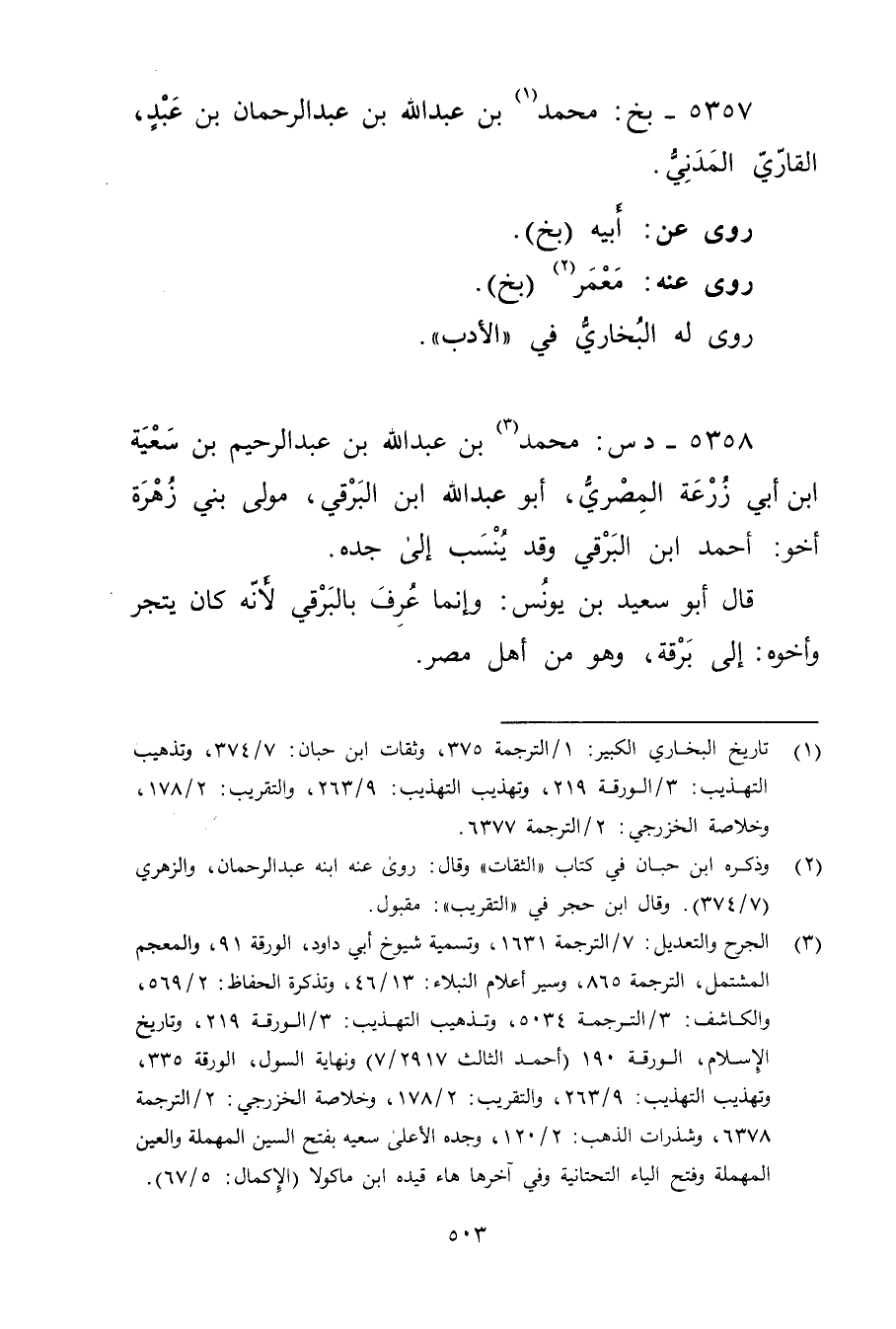 5358 - د س: مُحَمَّد بن عَبد الله بْن عَبد الرحيم بْن سعية ابن أَبي زرعة المِصْرِي (3) ، أَبُو عبد اللَّهِ بن البرقي، مولى بَنِي زهرة أخو: أَحْمَد بْن البرقي وقد ينسب إلى جده.