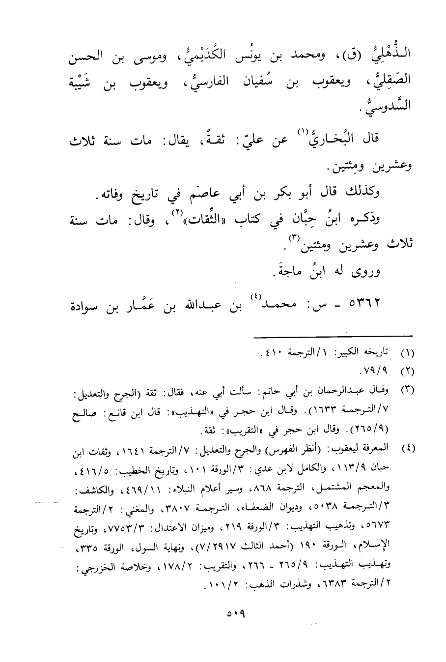 (4) المعرفة ليعقوب: "أنظر الفهرس) والجرح والتعديل: 7 / الترجمة 1641، وثقات ابن حبان 9 / 113، والكامل لابن عدي: 3 / الورقة 101، وتاريخ الخطيب: 5 / 416، والمعجم المشتمل، الترجمة 868، وسير أعلام النبلاء: 11 / 469، والكاشف: 3 / الترجمة 5038، وديوان الضعفاء، الترجمة 3807، والمغني: 2 / الترجمة 5673، وتذهيب التهذيب: 3 / الورقة 219، وميزان الاعتدال: 3 / 7753، وتاريخ الاسلام، الورقة 190 (أحمد الثالث 2917 / 7) ، ونهاية السول، الورقة 335، وتهذيب التهذيب: 9 / 265 - 266، والتقريب: 2 / 178، وخلاصة الخزرجي: 2 / الترجمة 6383، وشذرات الذهب: 2 / 101.