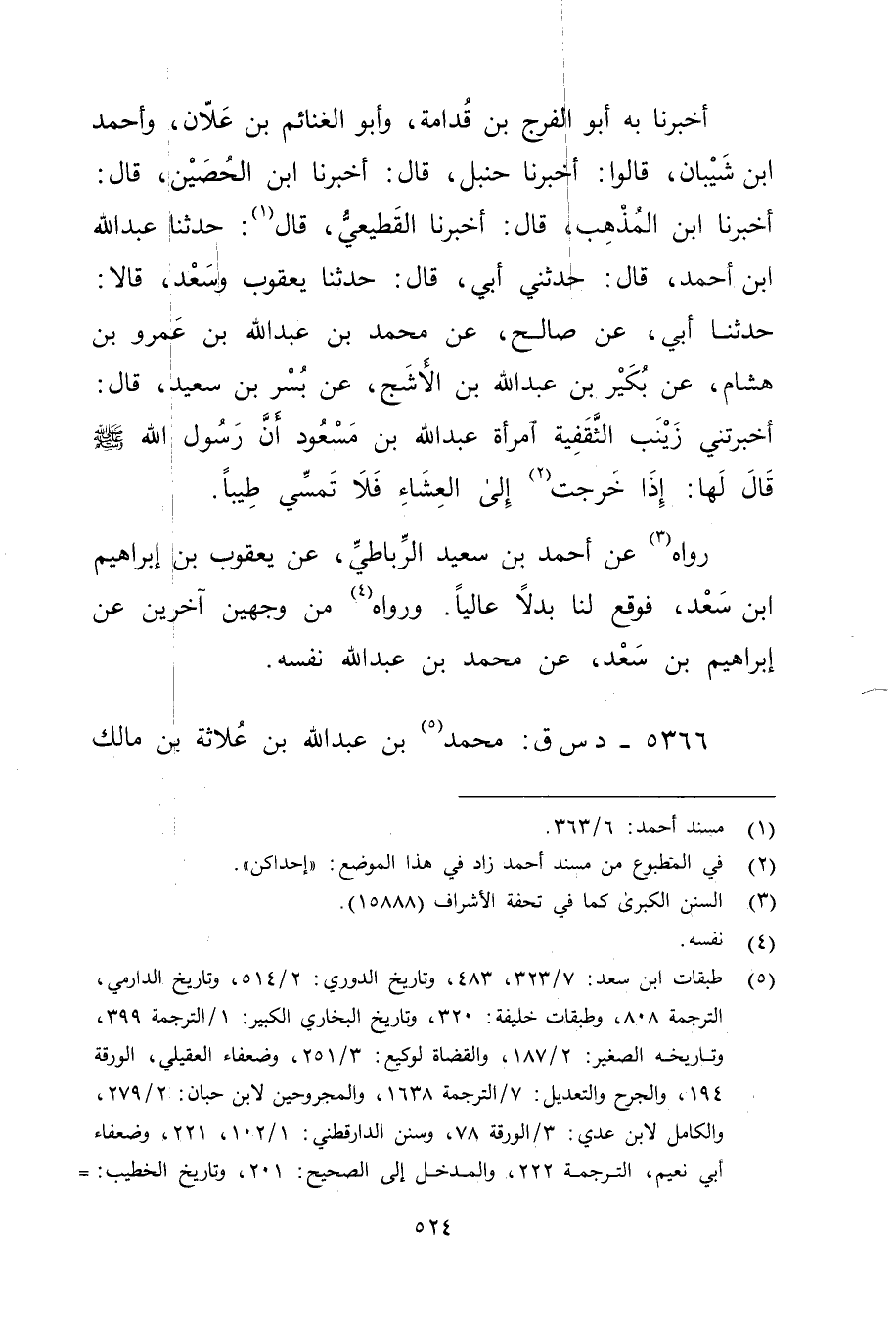أَخْبَرَنَا بِهِ أَبُو الْفَرَجِ بْنُ قُدَامَةَ، وأَبُو الْغَنَائِمِ بْنُ عَلانَ، وأَحْمَدُ بْنُ شَيْبَانَ، قَالُوا: أَخْبَرَنَا حنبل، قال: أخبرنا ابن الحصين، قال: أخبرنا ابْنُ الْمُذْهِب، قال: أخبرنا القَطِيعِيّ، قال (1) : حَدَّثَنَا عَبد اللَّهِ بْن أَحْمَدَ، قال: حَدَّثني أبي، قال: حَدَّثَنَا يعقوب وسَعْد، قالا: حَدَّثَنَا أبي، عن صالح، عَنْ مُحَمَّد بْن عَبد اللَّهِ بْن عَمْرو بْن هشام، عن بكير بْن عَبد الله بْن الأَشَجِّ، عَنْ بُسْرِ بْنِ سَعِيد، قال: أخبرتني زينب الثقفية امرأة عَبد اللَّهِ بْن مَسْعُود إن رَسُول اللَّهِ صلى الله عليه وسلم قال لها: إذا خرجت (2) إلى العشاء فلا تمسي طيبا.