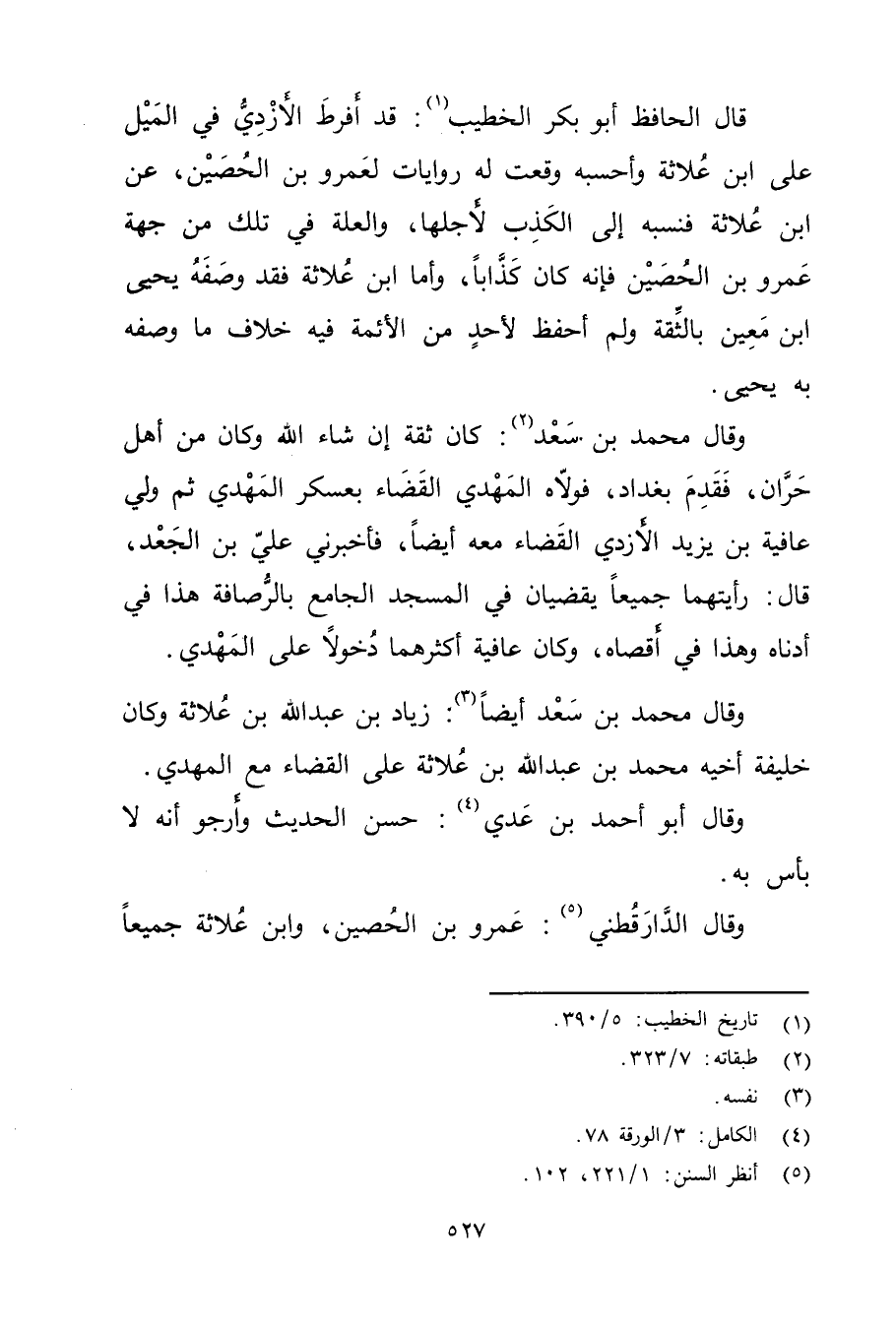 قال الْحَافِظ أَبُو بَكْر الْخَطِيب (1) : قد أفرط الأزدي في الميل على ابْن علاثة وأحسبه وقعت له روايات لعَمْرو بْن الحصين، عن ابن علاثة فنسبه إلى الكذب لأجلها، والعلة في تلك من جهة عَمْرو بْن الحصين فإنه كان كذابا، وأما ابن علاثة فقد وصفه يحيى ابن مَعِين بالثقة ولم أحفظ لأحد من الأئمة فيه خلاف ما وصفه به يَحْيَى.