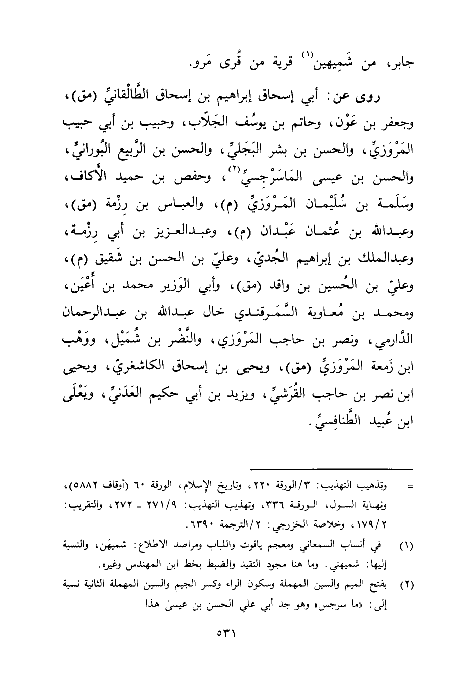 (2) بفتح الميم والسين المهملة وسكون الراء وكسر الجيم والسين المهملة الثانية نسبة إلى: "ما سرجس "وهو جد أبي علي الحسن بن عيسى هذا