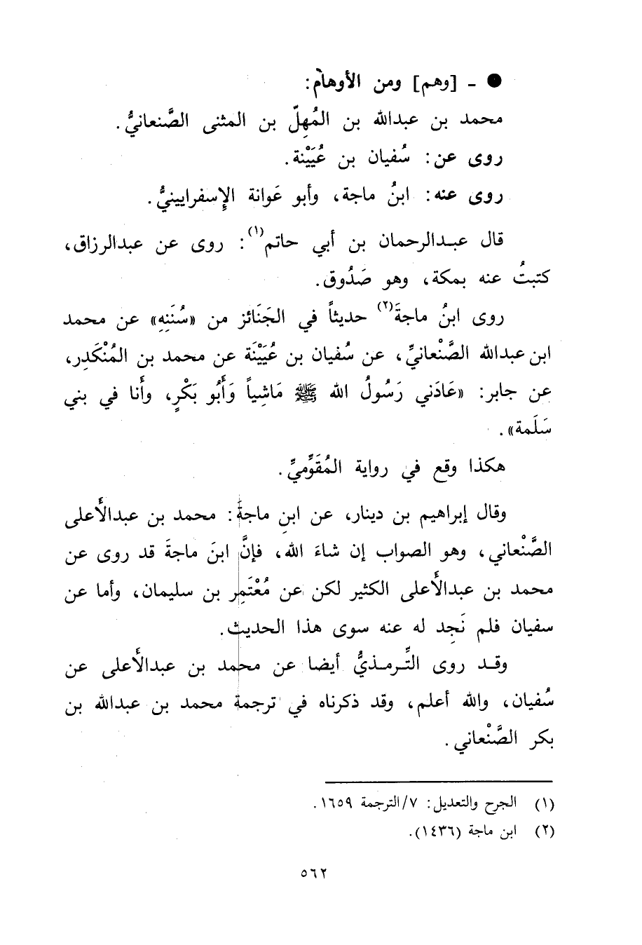 روى ابن ماجه (2) حديثا في الجنائز من "سننه "عَنْ مُحَمَّدِ ابْنِ عَبد اللَّهِ الصنعاني، عَنْ سُفْيَان بْن عُيَيْنَة عَنْ مُحَمَّد بْن المنكدر، عَنْ جابر: "عادني رَسُول اللَّهِ صَلَّى اللَّهُ عَلَيْهِ وسَلَّمَ ماشيا وأَبُو بكر، وأنا في بني سلمة.
