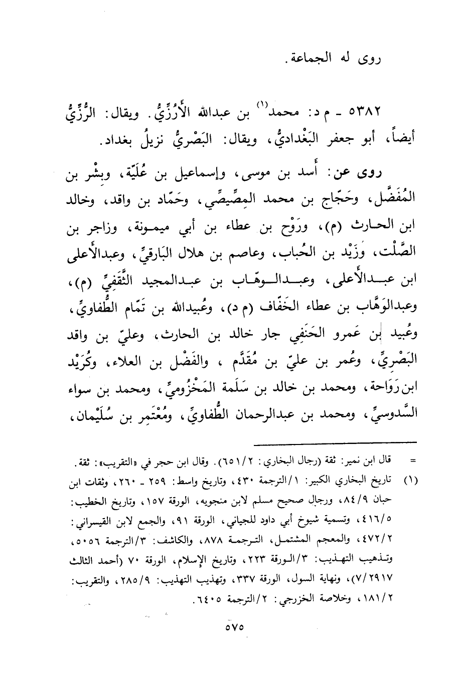 5382 - م د: مُحَمَّدُ بْنُ عَبد اللَّهِ الأَرُزِّيُّ (1) . ويُقال: الرزي أيضا، أَبُو جعفر البغدادي، ويُقال: البَصْرِيّ نزيل بغداد.