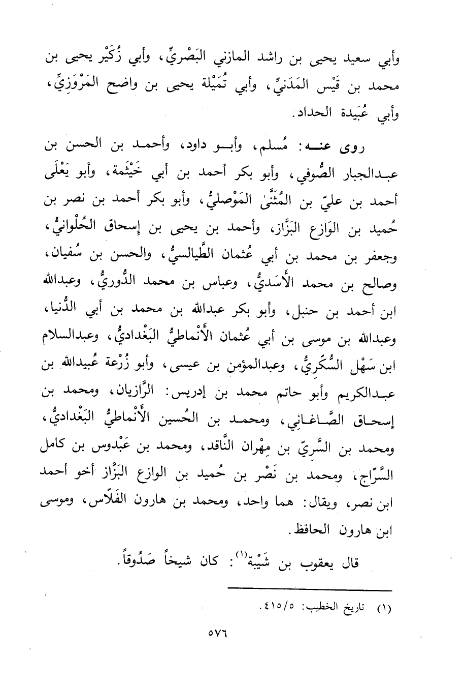وأبي سَعِيد بن يَحْيَى بْن راشد المازني البَصْرِيّ، وأبي زكير يَحْيَى بْن مُحَمَّد بْن قيس المدني، وأبي تميلة يَحْيَى بْن واضح المروزي، وأبي عُبَيدة الحداد.
