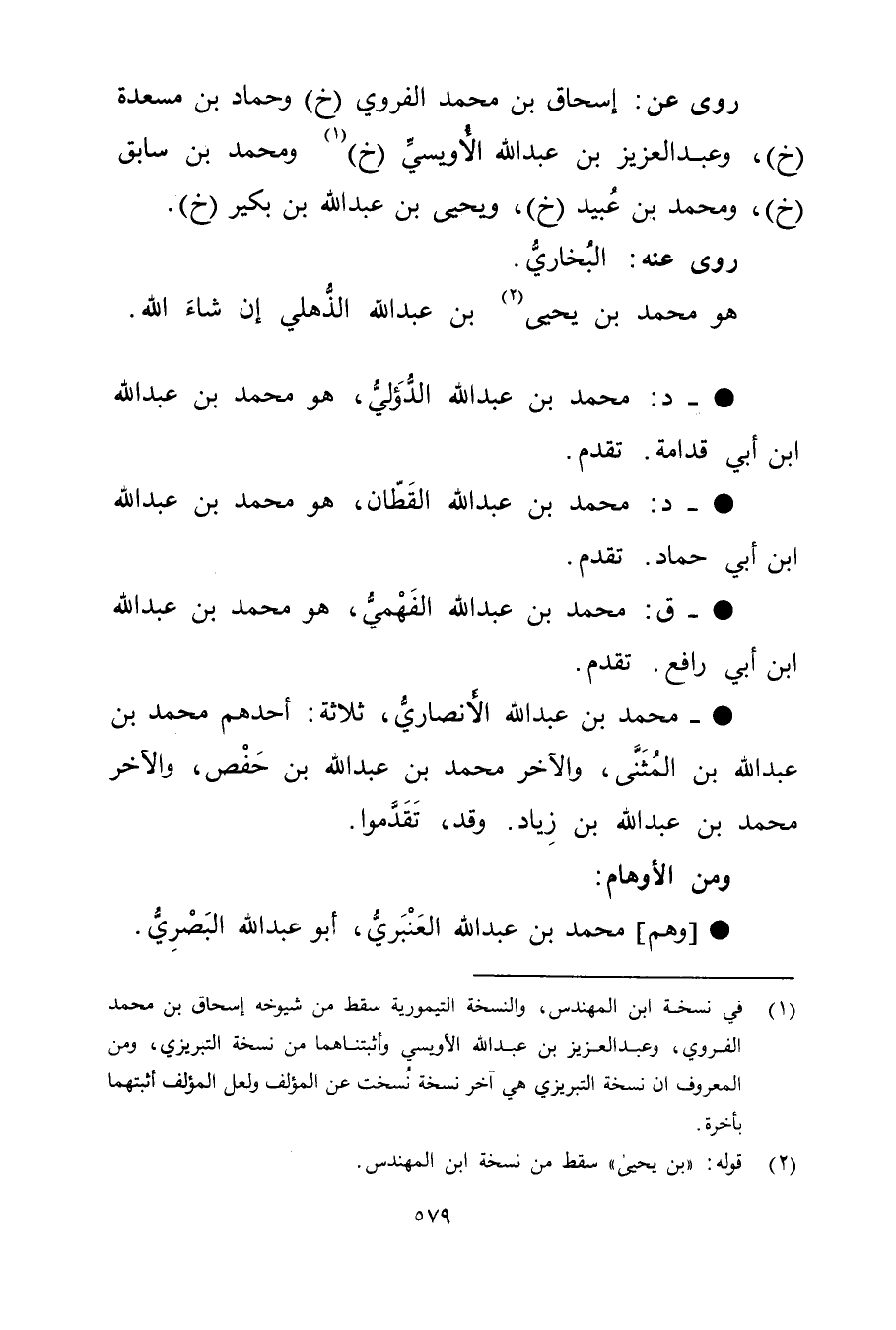 (1) في نسخة ابن المهندس، والنسخة التيمورية سقط من شيوخه إسحاق بن محمد الفروي، وعبد العزيز بْن عَبد اللَّهِ الأُوَيسي وأثبتناهما من نسخة التبريزي، ومن المعروف ان نسخة التبريزي هي آخر نسخة نسخت عن المؤلف ولعل المؤلف أثبتهما بأخرة.