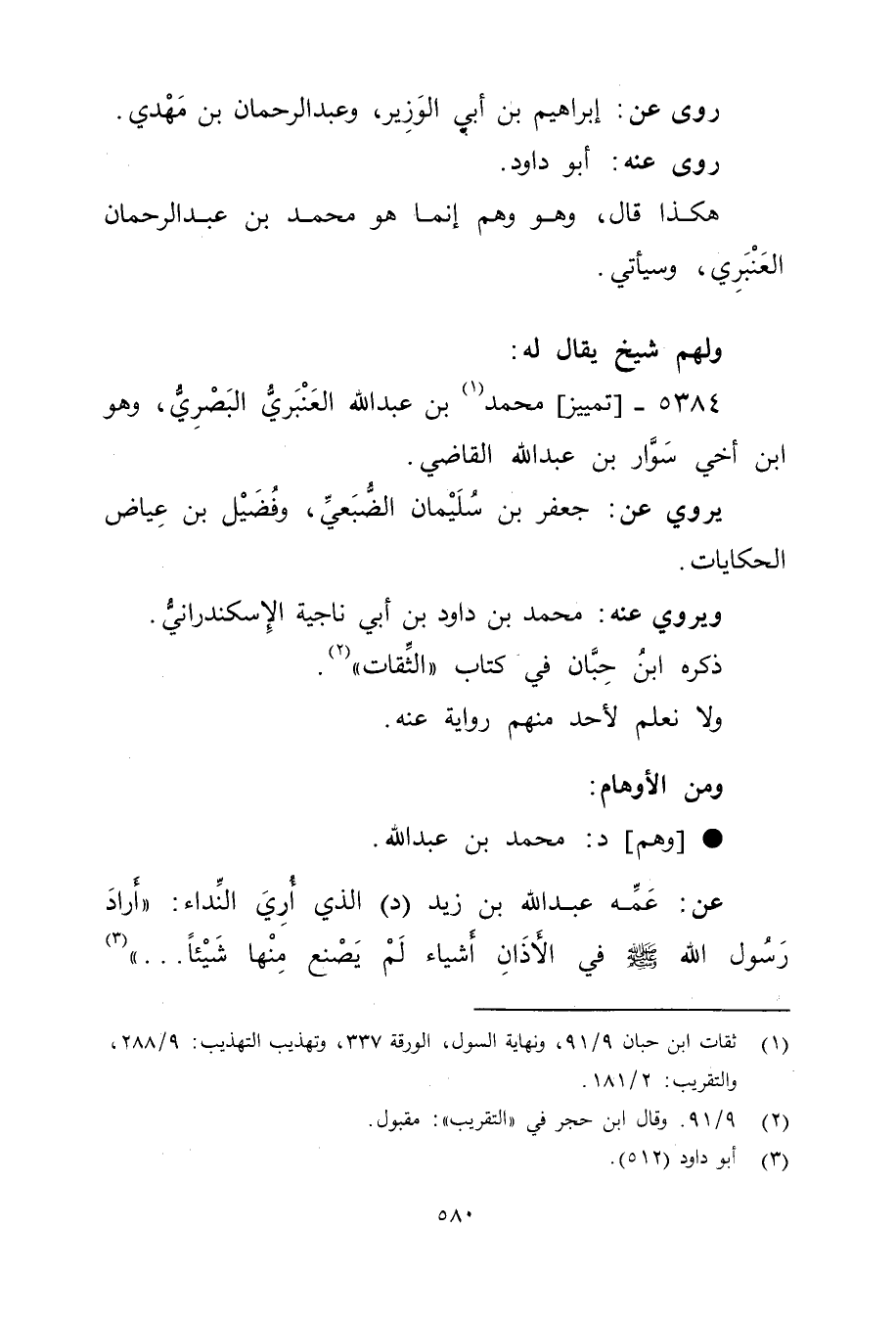 5384 - تمييز مُحَمَّد بْن عَبد اللَّهِ الْعَنْبَرِيّ البَصْرِيّ (1) ، وهو ابن أخي سوار بْن عَبد اللَّه القاضي.
