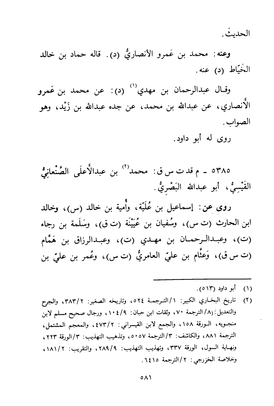 (2) تاريخ البخاري الكبير: 1 / الترجمة 524، وتاريخه الصغير: 2 / 383، والجرح والتعديل: 8 / الترجمة 70، وثقات ابن حبان: 9 / 104، ورجال صحيح مسلم لابن منجويه، الورقة 158، والجمع لابن القيسراني: 2 / 473، والمعجم المشتمل، الترجمة 881، والكاشف: 3 / الترجمة 5057، وتذهيب التهذيب: 3 / الورقة 223، ونهاية السول، الورقة 337، وتهذيب التهذيب: 9 / 289، والتقريب: 2 / 181، وخلاصة الخزرجي: 2 / الترجمة 6415.