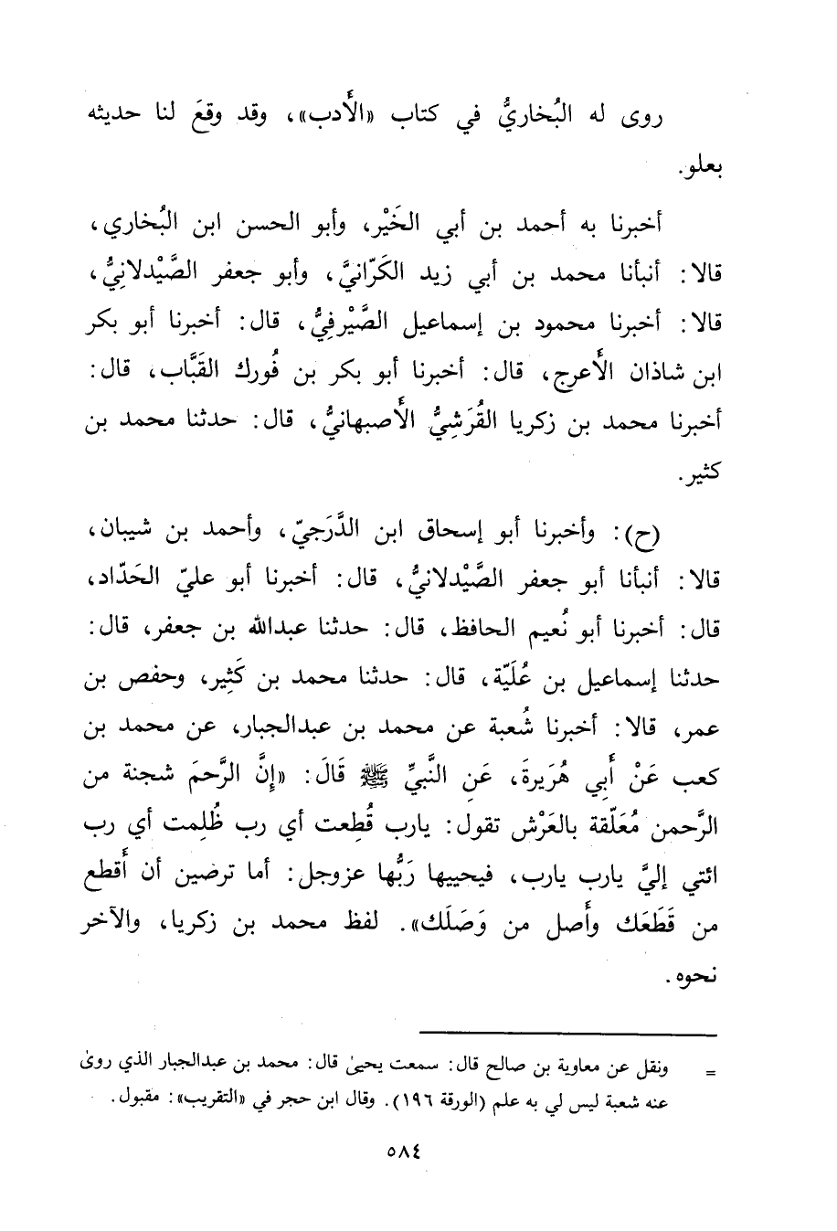 (ح) : وأَخْبَرَنَا أَبُو إِسْحَاقَ ابْنُ الدَّرَجِيِّ، وأَحْمَدُ بْنُ شَيْبَانَ، قالا: أَنْبَأَنَا أَبُو جَعْفَرٍ الصَّيْدَلانِيُّ، قال: أَخْبَرَنَا أَبُو عَلِيّ الحداد، قال: أَخْبَرَنَا أَبُو نعيم الحافظ، قال: حَدَّثَنَا عَبد اللَّهِ بْنُ جَعْفَرٍ، قال: حَدَّثَنَا إسماعيل بن عُلَيَّةَ، قال: حَدَّثَنَا مُحَمَّدُ بْنُ كَثِيرٍ وحَفْصُ بْنُ عُمَر، قَالا: أَخْبَرَنَا شُعْبَةُ عَنْ مُحَمَّدِ بْنِ عَبْدِ الْجَبَّارِ، عَنْ مُحَمَّدِ بْنِ كَعْبٍ عَن أَبِي هُرَيْرة، عَنِ النبي (ص) قال: إِنَّ الرَّحِمَ شُجْنَةٌ مِنْ الرَّحْمَنِ مُعَلَقَةٌ بِالْعَرْشِ تَقُولُ: يَا رَبِّ قُطِعْتُ أَيْ رَبِّ ظُلِمْتُ أَيْ رَبِّ ائْتِي إِلَيَّ يَا رَبِّ يَا رَبِّ، فُيُحْيِيهَا رَبُّهَا عزوجل: أما ترصين أَنْ أَقْطَعَ مَنْ قَطَعَكِ وأَصِلَ مَنْ وصَلَكَ ". لَفْظُ مُحَمَّدِ بْنِ زكريا، والآخر نحوه.