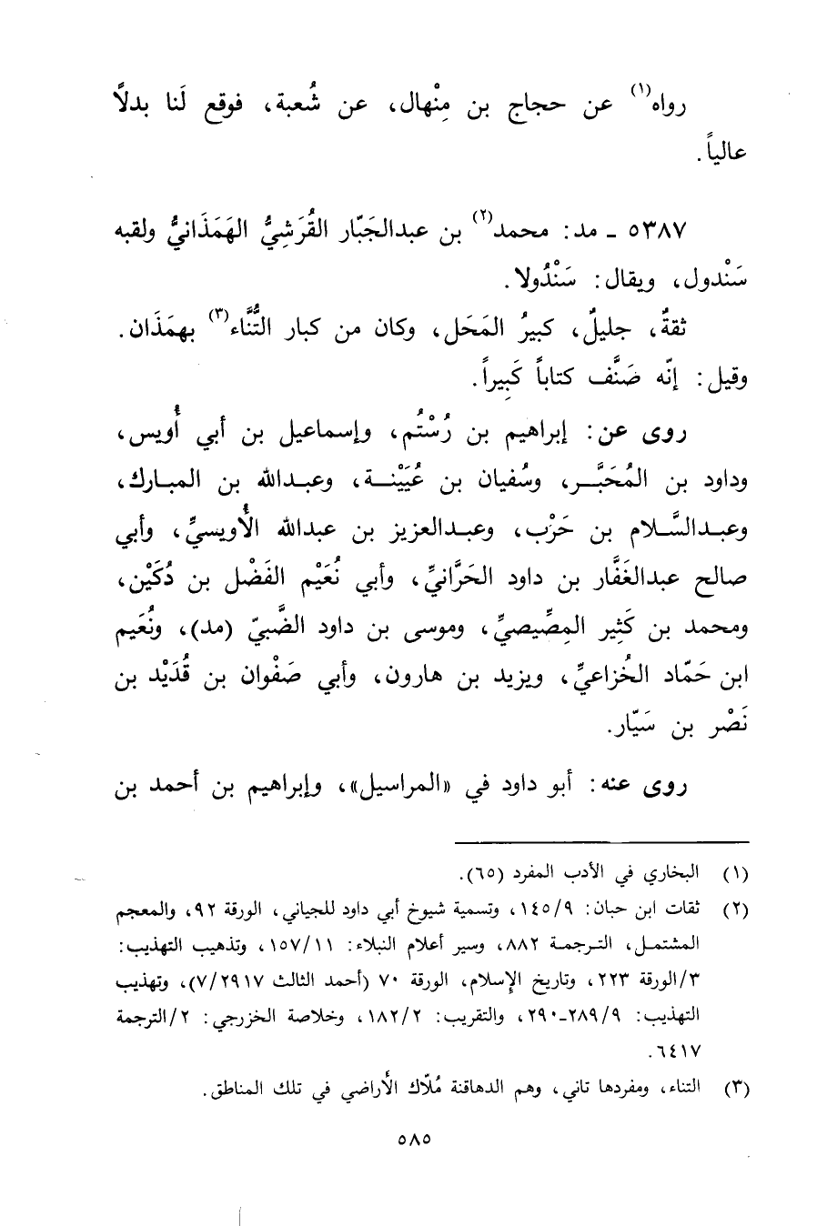 5387 - مد: مُحَمَّد بن عبد الجبار القرشي الهمذاني ولقبه سندول (2) ، ويُقال: سندولا.