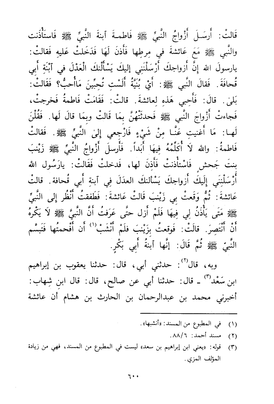 قَالَتْ: أَرَسَلَ أَزْوَاجُ النَّبِيِّ صَلَّى اللَّهُ عَلَيْهِ وسَلَّمَ فَاطِمَةَ ابْنَةَ النَّبِيُّ صلى الله عليه وسلم فَاسْتَأَذَنَتْ والنَّبِيُّ صَلَّى اللَّهُ عَلَيْهِ وسَلَّمَ مَعَ عَائِشَةَ فِي مِرْطِهَا فَأَذَنَ لَهَا فَدَخَلَتْ عَلَيْهِ فَقَالَتْ: يَا رَسُولَ اللَّهِ إِنَّ أَزْوَاجَكَ أَرْسَلْنَنِي إِلَيْكَ يَسْأَلَنَكَ الْعَدْلَ فِي ابْنَةِ أَبِي قُحَافَةَ. فَقَالَ النَّبِيُّ صَلَّى اللَّهُ عَلَيْهِ وسَلَّمَ: أي بُنَيَّةُ أَلَسْتِ تُحِبِّينَ مَا أُحِبُّ؟ فَقَالَتْ: بَلَى. قال: فَأَحِبِّي هَذَهِ لِعَائِشَةَ. قَالَتْ: فَقَامَتْ فَاطِمَةُ فَخَرَجَتْ، فَجَاءَتْ أَزْوَاجَ النَّبِيِّ صَلَّى اللَّهُ عَلَيْهِ وسَلَّمَ فَحَدَّثَتْهُنَّ بِمَا قَالَتْ وبِمَا قال لَهَا. فَقُلْنَ لَهَا: مَا أَغْنَيْتِ عَنَّا مِنْ شَيْءٍ فَارْجَعِي إِلَى النَّبِيِّ صَلَّى اللَّهُ عَلَيْهِ وسَلَّمَ. فَقَالَتْ فَاطِمَةُ: واللَّهِ لا أُكَلِّمُهُ فِيهَا أَبَدًا. فَأَرْسَلَ أَزْوَاجِ النَّبِيِّ صَلَّى اللَّهُ عَلَيْهِ وسَلَّمَ زَيْنَبَ بِنْتَ جَحْشٍ فَاسْتَأْذَنَتْ فَأَذَنَ لَهَا، فَدَخَلَتْ فَقَالَتْ: يَا رَسُولَ اللَّهِ أَرْسَلْنَنِي إِلَيْكَ أَزْوَاجُكَ يَسْأَلَنَكَ الْعَدْلَ فِي ابْنَةِ أَبِي قُحَافَةَ. قَالَتْ عَائِشَةُ: ثُمَّ وقَعَتْ بِي زَيْنَبُ قَالَتْ عَائِشَةُ: فَطَفَقْتُ أَنْظُرُ إِلَى النَّبِيِّ صلى الله عَلَيْهِ وسَلَّمَ مَتَى يَأَذَنُ لِي فِيهَا فَلَمْ أَزَلْ حَتَّى عَرَفْتُ أَنَّ النَّبِيَّ صلى الله عليه وسَلَّمَ لا يَكْرَهُ أَنْ أَنْتَصِرَ. قَالَتْ: فَوَقَعْتُ بِزَيْنَبَ فَلَمْ أَنْشَبْ (1) أَنْ أَفْحَمْتُهَا فَتَبَسَّمَ النَّبِيُّ صَلَّى اللَّهُ عَلَيْهِ وسَلَّمَ ثُمَّ قال: إِنَّهَا ابْنَةُ أَبِي بَكْرٍ.