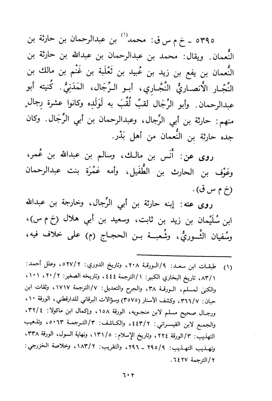 5395 - خ م س ق مُحَمَّد بْن عَبْد الرَّحْمَنِ بْن حارثة بن النعمان (1) . ويُقال: مُحَمَّد بْن عَبْد الرَّحْمَنِ بْن عَبد اللَّهِ بْنِ حارثة بْن النعمان بْن يفع بْن زيد بْن عُبَيد بْن ثعلبة بْن غنم بن مالك بن النجار الأَنْصارِيّ النجاري، أَبُو الرجال، المدني. كنيته أَبُو عبد الرحمن. وأَبُو الرجال لقب لقب بن لولده وكانوا عشرة رجال منهم: حارثة بْن أَبي الرجال، وعبد الرحمن بْن أَبي الرجال.