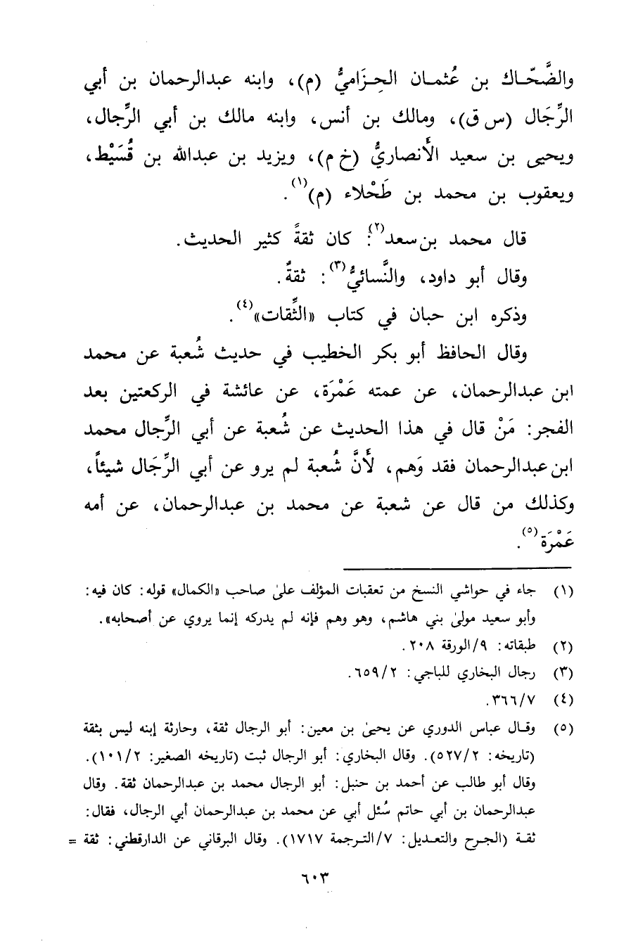 (5) وَقَال عَباس الدُّورِيُّ عَن يحيى بن مَعِين: أبو الرجال ثقة، وحارثة إبنه ليس بثقة (تاريخه: 2 / 527) . وقَال البُخارِيُّ: أبو الرجال ثبت (تاريخه الصغير: 2 / 101) . وَقَال أبو طالب عَن أحمد بن حنبل: أَبُو الرجال مُحَمَّد بْن عبد الرحمن ثقة. وَقَال عَبْد الرَّحْمَنِ بْن أَبي حاتم سئل أبي عن مُحَمَّد بْن عبد الرحمن أبي الرجال، فقال: ثقة (الجرح والتعديل: 7 / الترجمة 1717) .