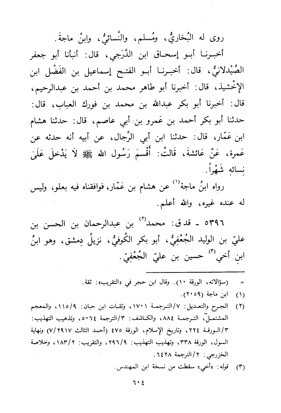 5396 - قد ق: مُحَمَّد بْن عَبْد الرَّحْمَنِ بْن الْحَسَن بن علي بن الوليد الجعفي (2) ، أَبُو بكر الكوفي، نزيل دمشق، وهو ابن ابْن أخي (3) حسين بن علي الجعفي.