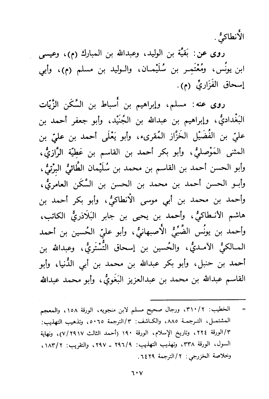 = الخطيب: 2 / 310، ورجال صحيح مسلم لابن منجويه، الورقة 158، والمعجم المشتمل، الترجمة 885، والكاشف: 3 / الترجمة 5065، وتذهيب التهذيب: 3 / الورقة 224، وتاريخ الاسلام، الورقة 190 (أحمد الثالث 2917 / 7) ، ونهاية السول، الورقة 338، وتهذيب التهذيب: 9 / 296 - 297، والتقريب: 2 / 183، وخلاصة الخزرجي: 2 / الترجمة 6429.