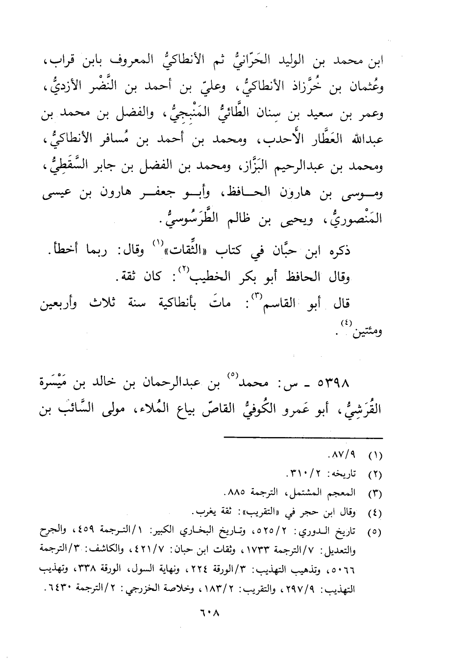 (5) تاريخ الدوري: 2 / 525، وتاريخ البخاري الكبير: 1 / الترجمة 459، والجرح والتعديل: 7 / الترجمة 1733، وثقات ابن حبان: 7 / 421، والكاشف: 3 / الترجمة 5066، وتذهيب التهذيب: 3 / الورقة 224، ونهاية السول، الورقة 338، وتهذيب التهذيب: 9 / 297، والتقريب: 2 / 183، وخلاصة الخزرجي: 2 / الترجمة 6430.