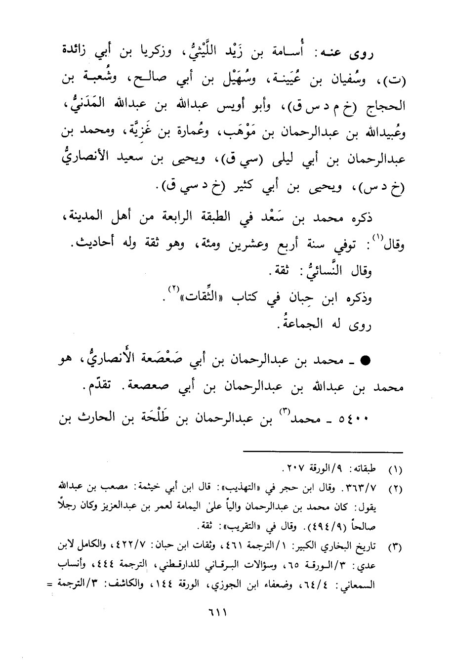 (2) 7 / 363. وَقَال ابن حجر في "التهذيب ": قال ابن أَبي خيثمة: مصعب بن عَبد الله يقول: كان محمد بن عبد الرحمن واليا على اليمامة لعُمَر بْن عبد العزيز وكَانَ رجلا صالحا (9 / 494) . وَقَال في "التقريب": ثقة.