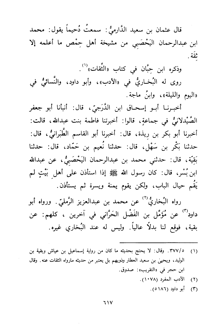 رَوَاهُ الْبُخَارِيُّ (2) عَنْ مُحَمَّد بْن عبد العزيز الرملي. ورَوَاهُ أَبُو دَاوُدَ (3) عَنْ مُؤَمَّلِ بْنِ الْفَضْلِ الْحَرَّانِيِّ فِي آخَرِينَ، كلهم: عَنْ بقية، فوقع لنا بَدَلا عَالِيًا. ولَيْسَ لَهُ عِنْدَ البخاري غيره.