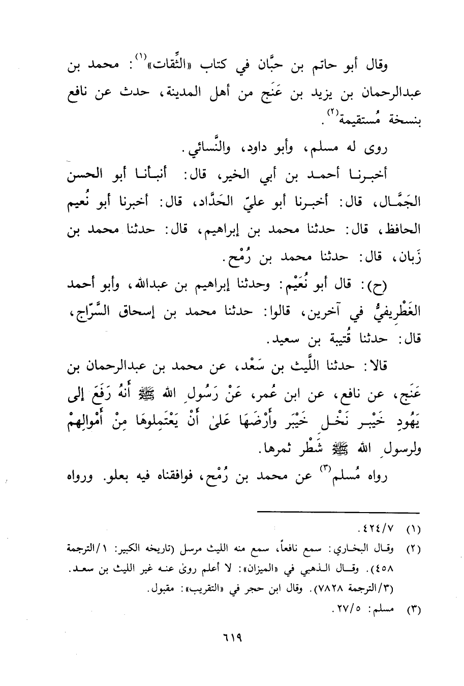وَقَال أَبُو حاتم بْن حبان في كتاب "الثقات" (1) : مُحَمَّد بن عَبْد الرحمن بن يزيد بْن عنج من أهل المدينة، حدث عن نافع بنسخة مستقيمة (2) .