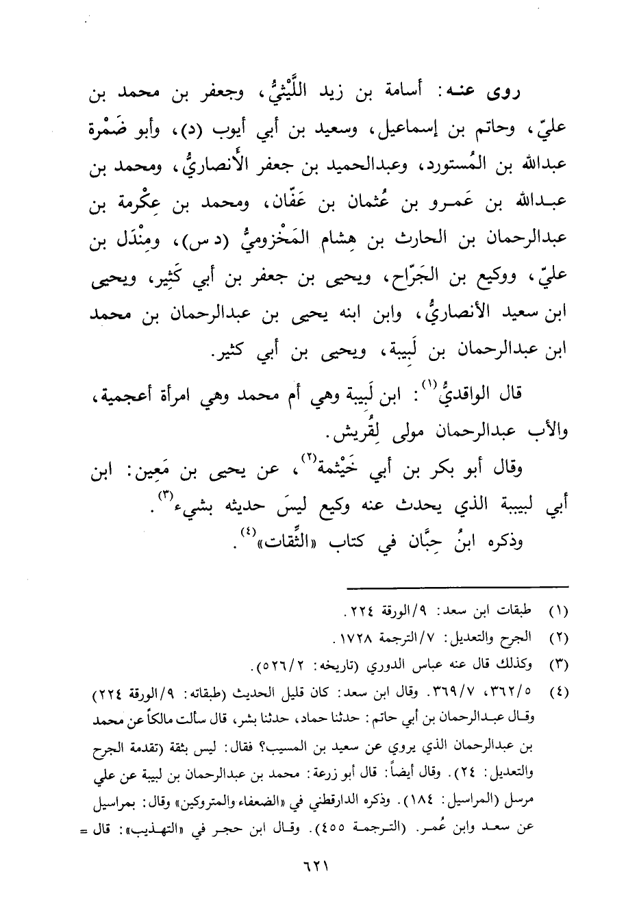 (4) 5 / 362، 7 / 369. وَقَال ابن سعد: كان قليل الحديث (طبقاته: 9 / الورقة 224) وَقَال عَبْد الرَّحْمَنِ بْن أَبي حاتم: حَدَّثَنَا حماد، حَدَّثَنَا بشر، قال سألت مالكا عَنْ مُحَمَّد بْن عَبْد الرحمن الذي يروي عن سَعِيد بْن المُسَيَّب؟ فقال: ليس بثقة (تقدمة الجرح والتعديل: 24) . وَقَال أيضا: قال أبو زُرْعَة: مُحَمَّد بْن عَبْد الرَّحْمَنِ بْن لبيبة عن علي مرسل (المراسيل: 184) ، وذَكَره الدارقطني في "الضعفاء والمتروكين "وَقَال: بمراسيل عن سعد وابن عُمَر.
