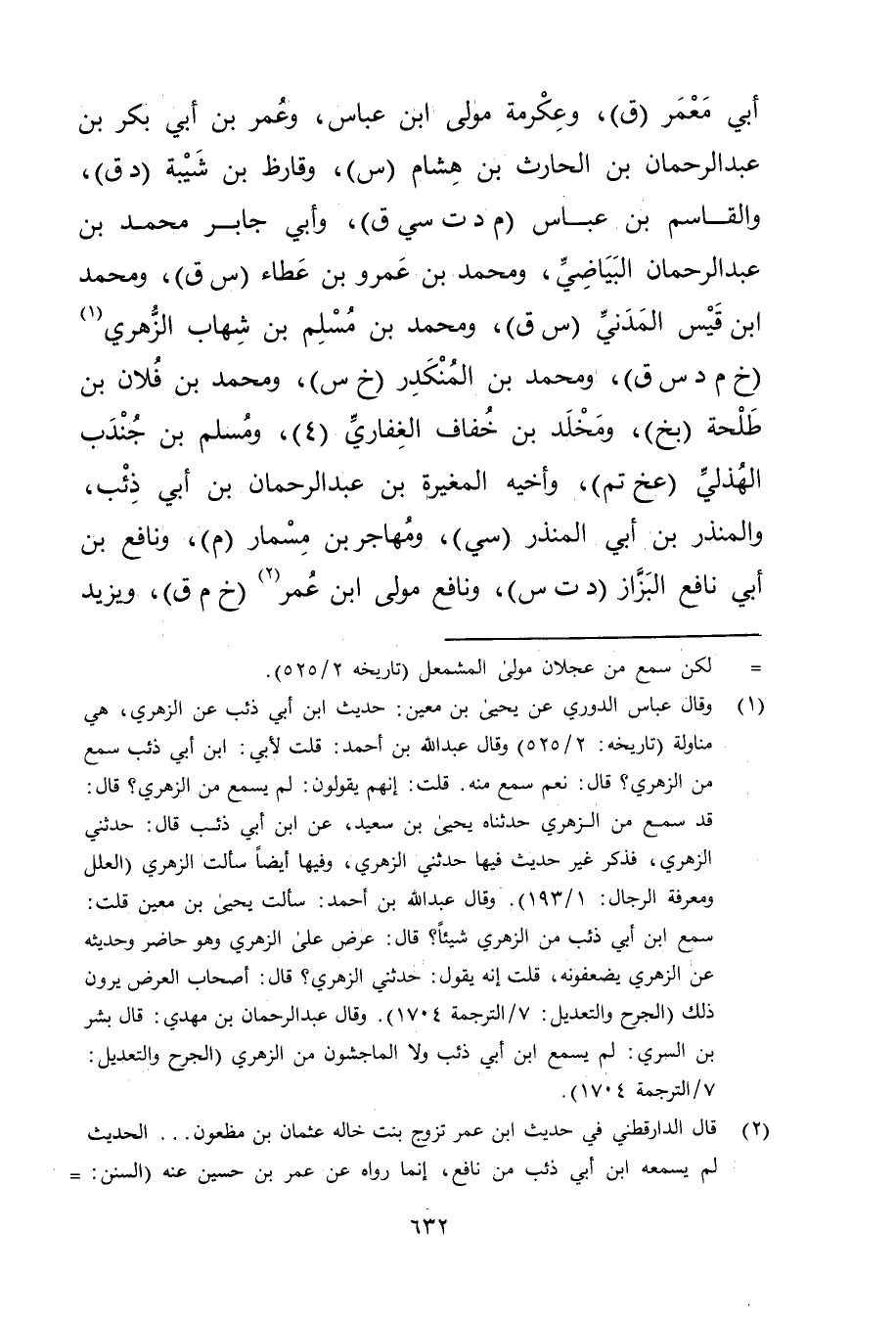 (1) وَقَال عَباس الدُّورِيُّ عَن يحيى بن مَعِين: حَدِيث ابْن أَبي ذئب عَنْ الزُّهْرِيّ، هي مناولة (تاريخه: 2 / 525) وَقَال عَبد اللَّهِ بْن أَحْمَد: قلتُ لأبي: ابن أَبي ذئب سمع من الزُّهْرِيّ؟ قال: نعم سمع منه. قلت: إنهم يقولون: لم يسمع من الزُّهْرِيّ؟ قال: قد سمع من الزُّهْرِيّ حَدَّثَنَاه يَحْيَى بْن سَعِيد، عَنِ ابْن أَبي ذئب قال: حدثني الزُّهْرِيّ، فذكر غير حديثه فيها حدثني الزُّهْرِيّ، وفيها أيضا سألت الزُّهْرِيّ (العلل ومعرفة الرجال: 1 / 193) . وَقَال عَبد اللَّهِ بْن أَحْمَد: سألت يحيى بْن مَعِين قلت: سمع ابن أَبي ذئب من الزُّهْرِيّ شيئا؟ قال: عرض على الزُّهْرِيّ وهو حاضر وحديثه عن الزُّهْرِيّ يضعفونه، قلت إنه يقول: حدثني الزُّهْرِيّ؟ قال: أصحاب العرض يرون ذلك (الجرح والتعديل: 7 / الترجمة 1704) . وَقَال عبد الرحمن بن مهدي: قال بشر بن السري: لم يسمع ابن أَبي ذئب ولا المالجشون من الزُّهْرِيّ (الجرح والتعديل: 7 / الترجمة 1704) .