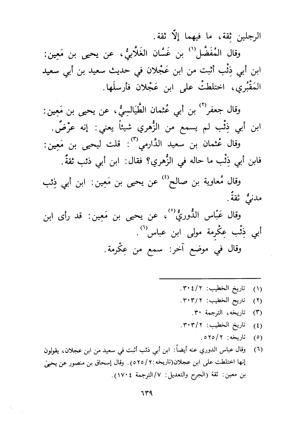 (6) وَقَال عَباس الدُّورِيُّ عنه أيضا: ابن أَبي ذئب أثبت في سَعِيد من ابن عجلان، يقولون إنها اختلطت على ابن عجلان (تاريخه: 2 / 525) . وَقَال إسحاق بْن منصور عَن يحيى بن مَعِين: ثقة (الجرح والتعديل: 7 / الترجمة 1704) .