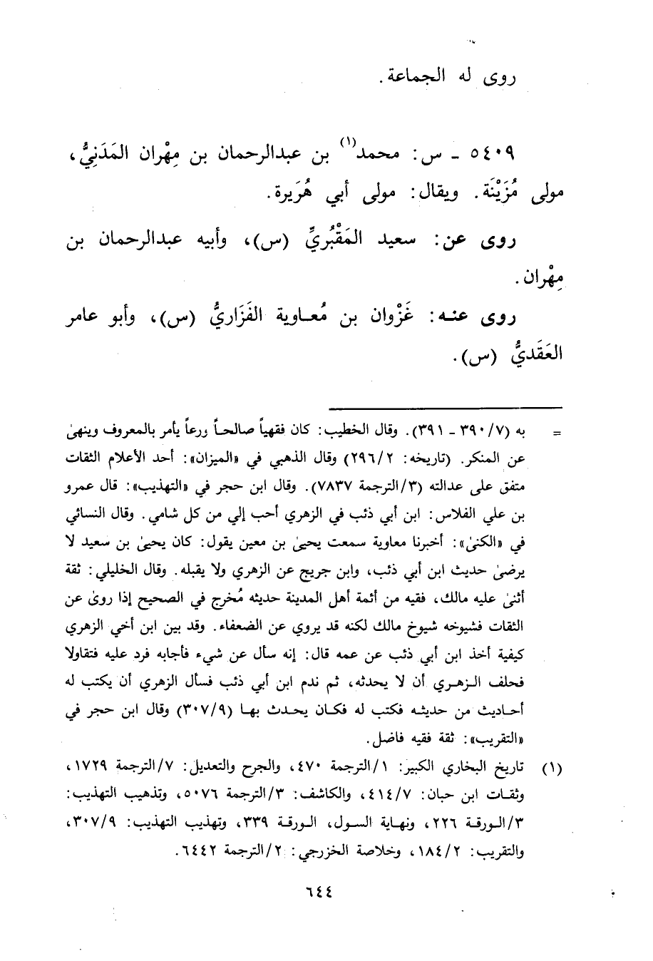 5409 - س: مُحَمَّد بْن عَبْد الرَّحْمَنِ بْن مهران المدني (1) ، مولى مزينة. ويُقال: مولى أبي هُرَيْرة.