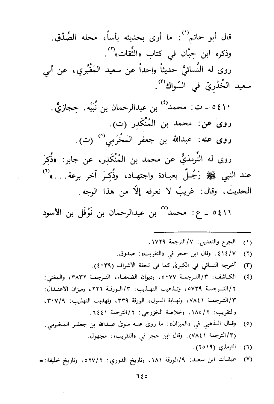 (4) الكاشف: 3 / الترجمة 5077، وديوان الضعفاء، الترجمة 3832، والمغني: 2 / الترجمة 5739، وتذهيب التهذيب: 3 / الورقة 226، وميزان الاعتدال: 3 / الترجمة 7841، ونهاية السو ل، الورقة 339، وتهذيب التهذيب: 9 / 307، والتقريب: 2 / 185، وخلاصة الخزرجي: 2 / الترجمة 6441.