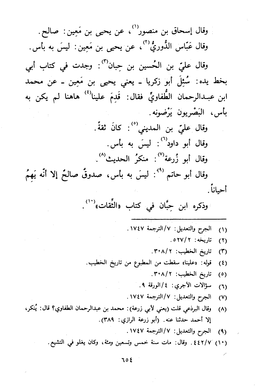 وَقَال علي بن الحسين بْن حبان (3) : وجدت فِي كتاب أبي بخط يده: سئل أَبُو زكريا، يعني يحيى بْن مَعِين، عَن مُحَمَّد ابْن عبد الرحمن الطفاوي فقال: قدم علينا (4) هاهنا لم يكن به بأس، البَصْرِيّون يرضونه.
