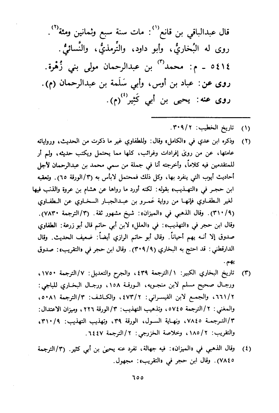 (3) تاريخ البخاري الكبير: 1 / الترجمة 439، والجرح والتعديل: 7 / الترجمة 1750، ورجال صحيح مسلم لابن منجويه، الورقة 158، ورجال البخاري للباجي: 2 / 661، والجمع لابن القيسراني: 2 / 473، والكاشف: 3 / الترجمة 5081، والمغني: 2 / الترجمة 5745، وتذهيب التهذيب: 3 / الورقة 226، وميزان الاعتدال: 3 / الترجمة 7845، ونهاية السول، الورقة 39، وتهذيب التهذيب: 9 / 310، والتقريب: 2 / 185، وخلاصة الخزرجي: 2 / الترجمة 6447.