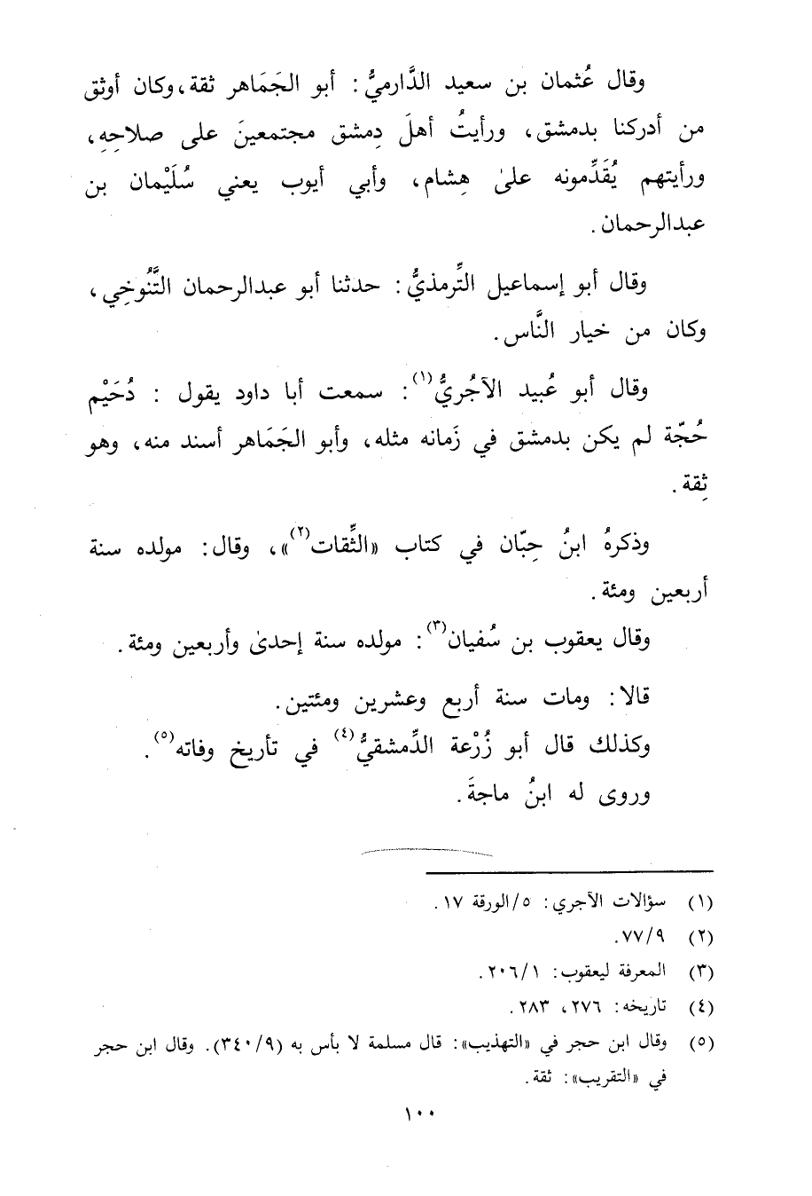 وَقَال أَبُو عُبَيد الآجري (1) : سمعت أبا داود يقول: دحيم حجة لم يكن بدمشق فِي زمانه مثله، وأَبُو الجماهر أسند منه، وهو وثقة.