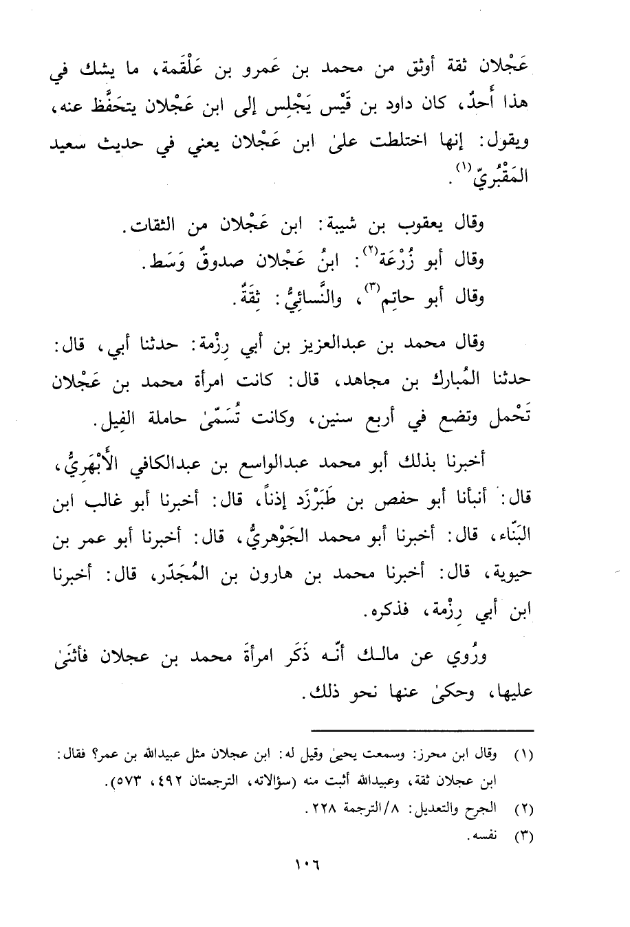 عجلان ثقة أوثق من مُحَمَّد بن عَمْرو بن علقمة، ما يشك في هذا أحد، كان داود بن قيس يجلس الى ابن عجلان يتحفظ عَنْهُ، ويقول: إنها اختلطت على ابن عجلان يعني في حديث سَعِيد المقبري (1) .