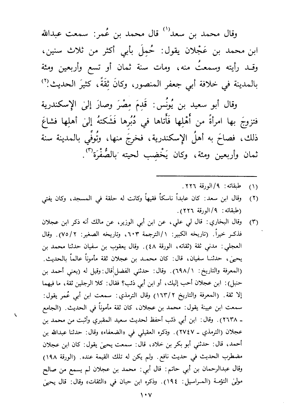 (3) وقَال البُخارِيُّ: قال لي علي، عن ابن أَبي الوزير، عن مالك أنه ذكر ابن عجلان فذكر خيرا. (تاريخه الكبير: 1 / الترجمة 603، وتاريخه الصغير: 2 / 75) . وَقَال العجلي: مدني ثقة (ثقاته، الورقة 48) . وَقَال يعقوب بْن سفيان حَدَّثَنَا محمد بن يحيى، حَدَّثَنَا سفيان، قال: كان محمد بن عجلان ثقة مأمونا عالما بالحديث. (المعرفة والتاريخ: 1 / 698) . وَقَال: حدثني الفضل قال: وقيل له (يعني أحمد بن حنبل) : ابن عجلان أحب إليك، أو ابن أَبي ذئب؟ فقال: كلا الرجلين ثقة، ما فيهما إلا ثقة. (المعرفة والتاريخ 2 / 163) وَقَال التِّرْمِذِيّ: سمعت ابن أَبي عُمَر يقول: سمعت ابن عُيَيْنَة يقول: محمد بن عجلان، كان ثقة مأمونا في الحديث. (الجامع - 2638) . وَقَال: ابن أَبي ذئب أحفظ لحديث سَعِيد المقبري وأثبت من محمد بن عجلان (التِّرْمِذِيّ - 2747) ، وذَكَره العقيلي في "الضعفاء "وَقَال: حَدَّثَنَا عبد الله بن أحمد، قال: حدثني أبو بكر بن خلاد، قال: سمعت يحيى يقول: كان ابن عجلان مضطرب الحديث في حديث نافع. ولم يكن له تلك القيمة عنده. (الورقة 198) وَقَال عبد الرحمن بن أَبي حاتم: قال أبي: محمد بن عجلان لم يسمع من صالح مولى التؤمة (المراسيل: 194) ، وذَكَره ابنُ حِبَّان في "الثقات" وَقَال: قال يحيى
