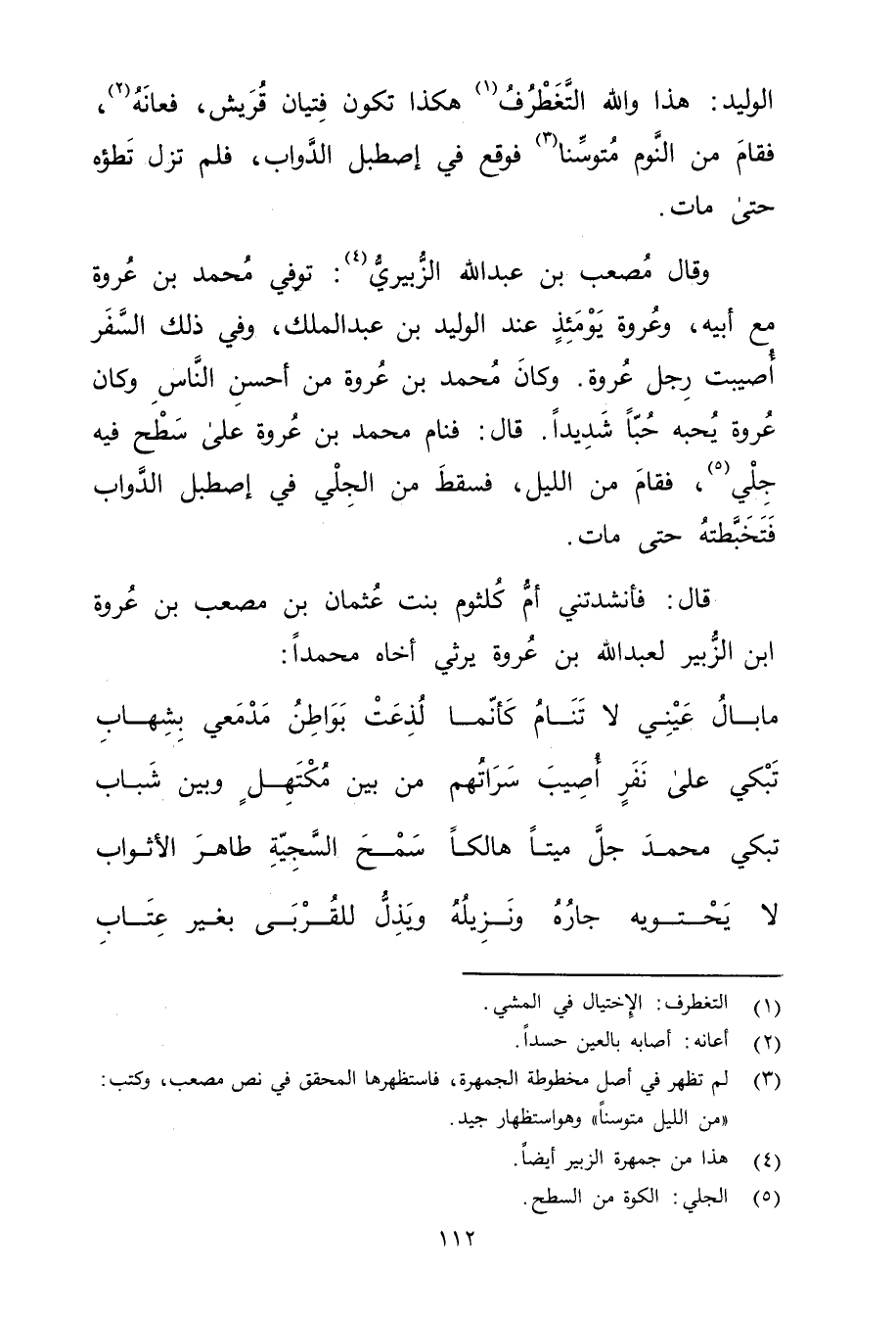 وَقَال مصعب بن عَبد اللَّهِ الزبيري (4) : توفي مُحَمَّد بن عروة مع أبيه، وعروة يومئذ عند الوليد بن عَبد المَلِك، وفي ذلك السفر أصيبت رجل عروة. وكان مُحَمَّد بن عروة من أحسن الناس وكان عروة يحبه حبا شديدا. قال: فنام مُحَمَّد بن عروة على سطح فيه جلي (5) ، فقام من الليل، فسقط من الجلي في إصطبل الدواب فتخبطته حتى مات.