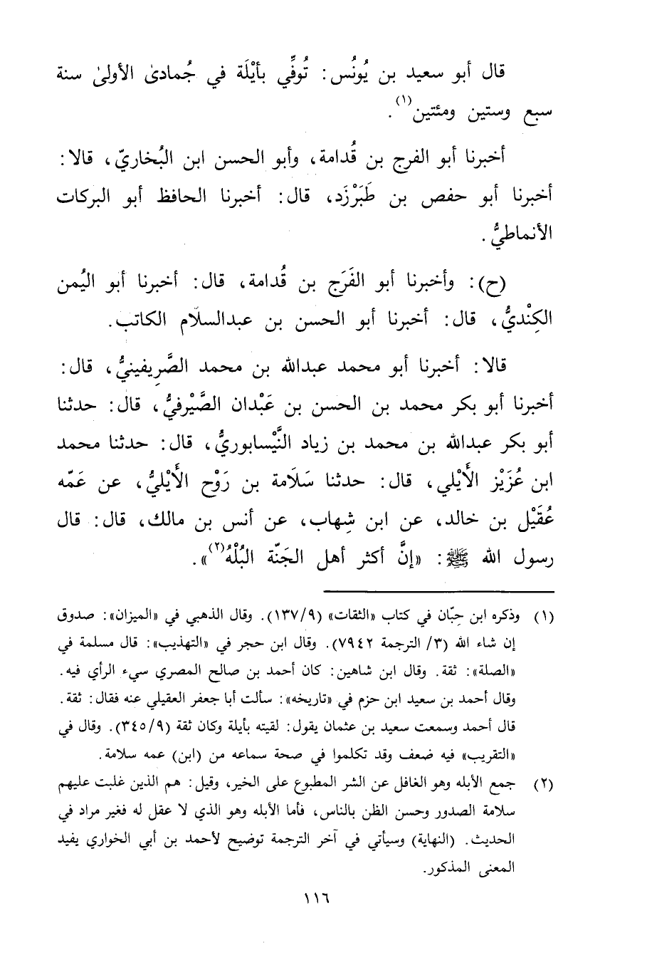 قَالا: أخبرنا أَبُو مُحَمَّد عَبد الله بن مححمد الصَّرِيفِينِيّ، قال: أخبرنا أَبُو بكر مُحَمَّد بْن الحسن بْن عبدان الصَّيْرَفِيُّ، قال: حَدَّثَنَا أَبُو بَكْرٍ عَبْد اللَّهِ بْن مُحَمَّد بْن زِيَادٍ النَّيْسَابُورِيُّ، قال: حَدَّثَنَا مُحَمَّدُ ابن عُزَيْزٍ الأَيْلِيُّ، قال: حَدَّثَنَا سَلامَةُ بْنُ رَوْحٍ الأَيْلِيُّ، عَنْ عَمِّهِ عُقَيْلِ بْنِ خَالِدٍ، عَنِ ابْنِ شِهَابٍ، عَنْ أَنَسِ بْنِ مَالِكٍ، قال: قال رَسُولُ اللَّهِ صلى اللَّهُ عَلَيْهِ وسَلَّمَ: "إِنَّ أَكْثَرَ أهل الجنة البله (2) .